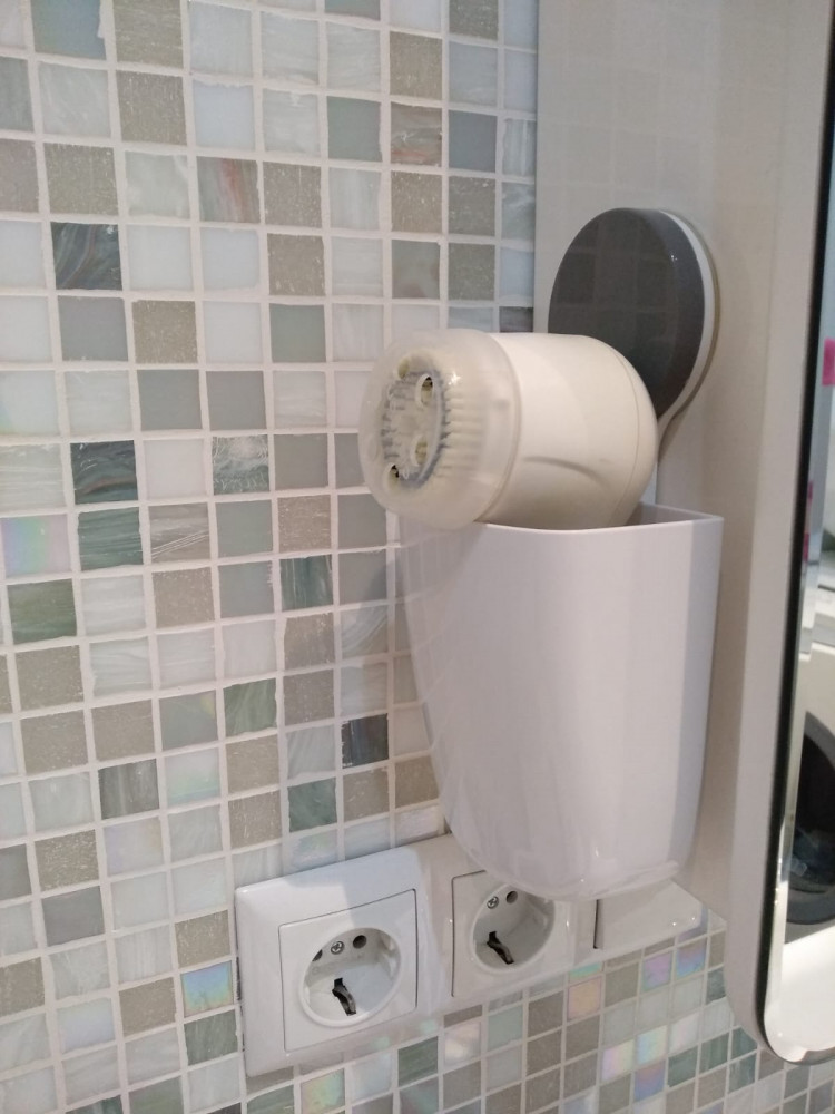 Идеально подошел для моего гаджета, щетка для умывания, держит хорошо. Прикрепила на торец навесного шкафчика. Купила также мыльницу из этой серии, но на кафеле из мозаики не держится, поэтому приклеила на липкую, прозрачную силиконовую ленту, отлично.