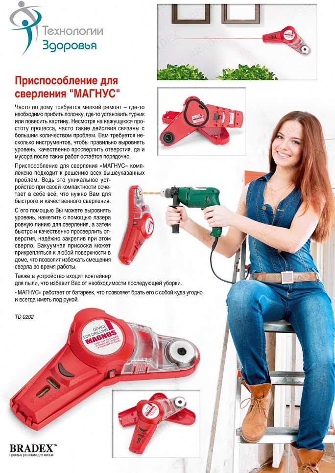 Bradex Приспособление для сверления «Магнус»В данный момент этот товар отсутствует в продаже. Возможно, у нас найдется аналогичный или похожий товар здесь. Серия: Дачный сезон Часто по дому требуется мелкий ремонт — где-то необходимо прибить полочку, где-то установить турник или повесить картину. Несмотря на кажущуюся простоту процесса, часто такие действия связаны с большим количеством проблем. Вам требуется несколько инструментов, чтобы правильно выровнять уровень, качественно просверлить отверстия, да и мусора после таких работ остаётся порядочно. |