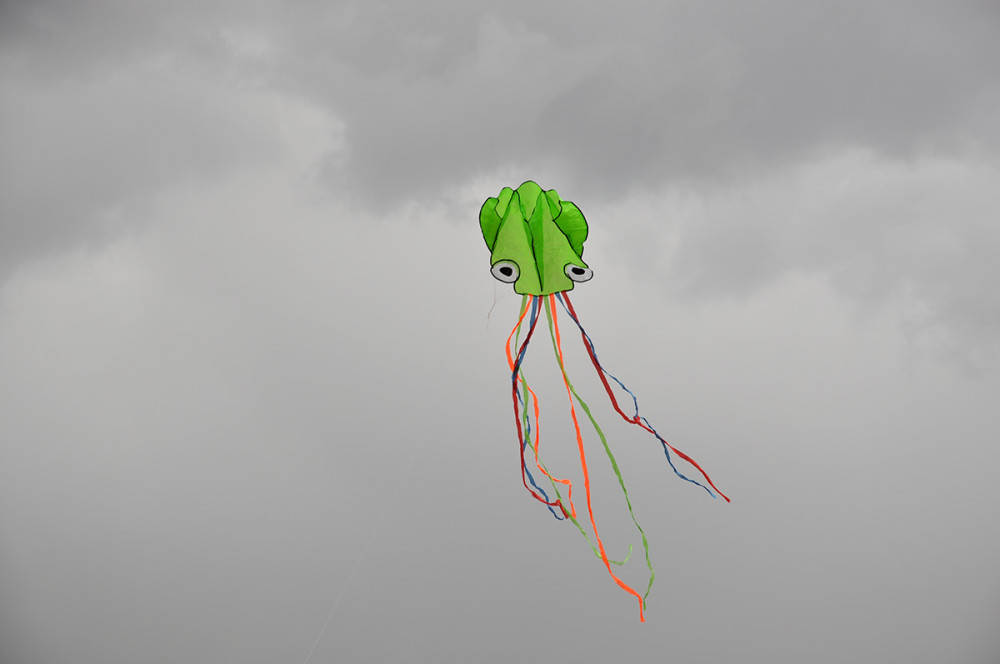 Этот осьминог - огромный: во все его секции задувает ветер и он надувается весь и взлетает. Имейте в виду, хвост - разноцветный и длиннющий всех цветов радуги: главное - не запутаться в хвостах и самих нитях. Рвётся в полёт от души. Желательно побольше пространства. Рекомендуем!