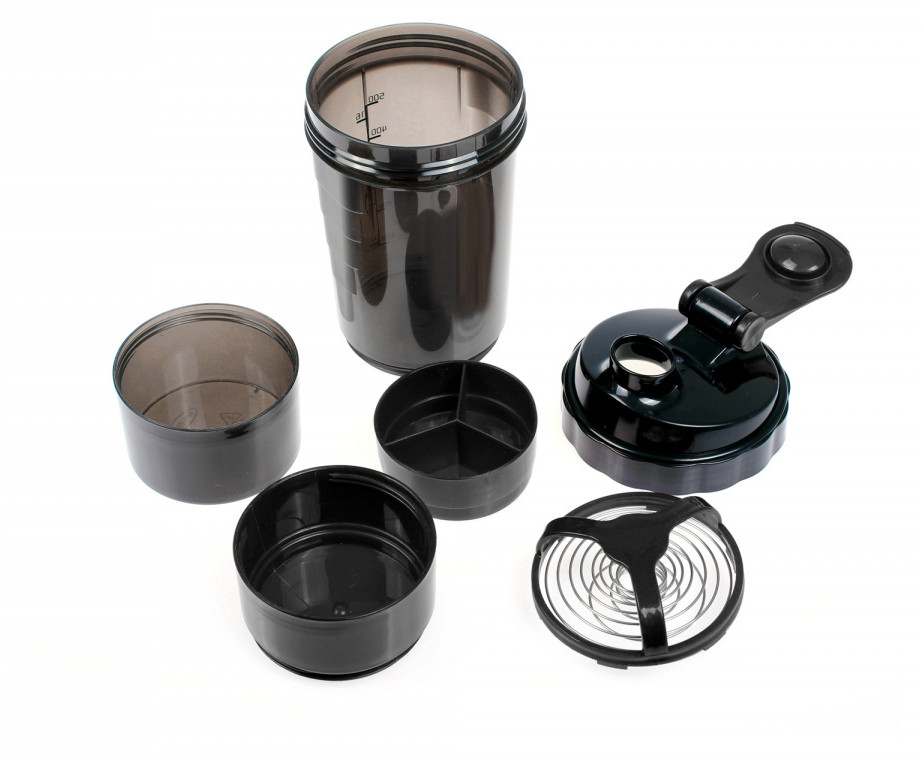 Шейкер для спортивного питания и смешивания протеиновых коктейлей — незаменимый аксессуар для занятий спортом. Встроенная пружина бесшумно смешивает напитки и не теряется как шарик из других шейкеров. Два отсека для порошка в комплекте — берите с собой в 2 раза больше протеина. А в отдельном отсеке с 3 секциями носите витамины в таблетках и капсулах.