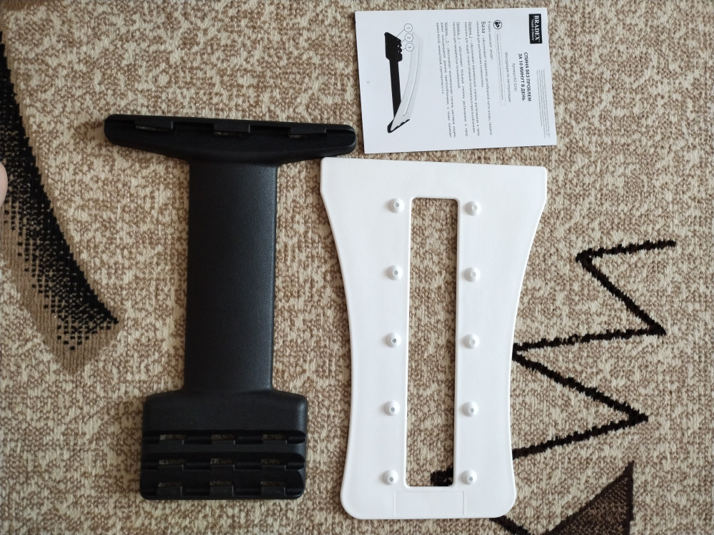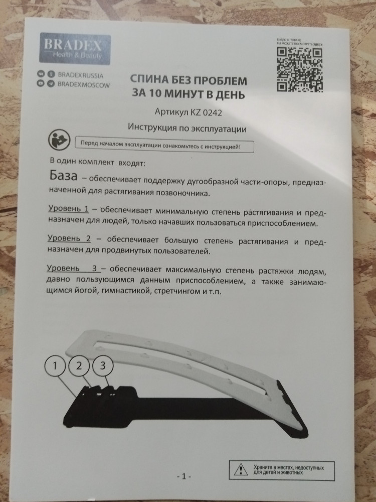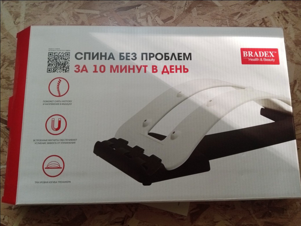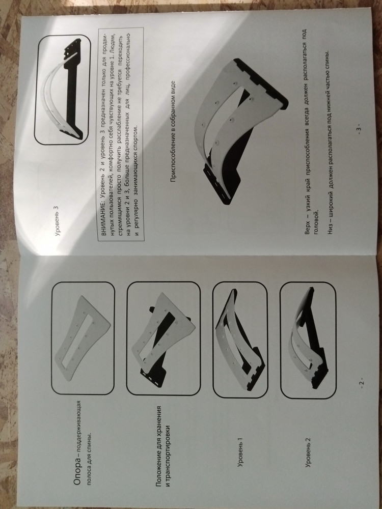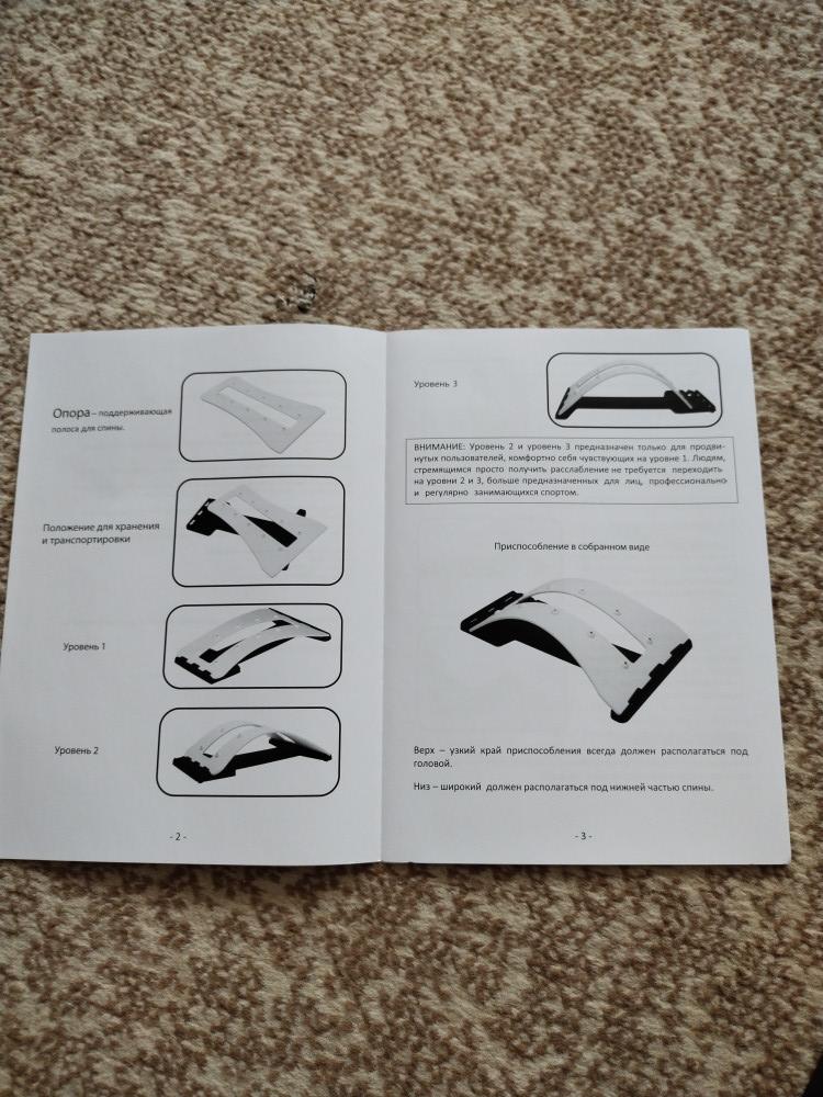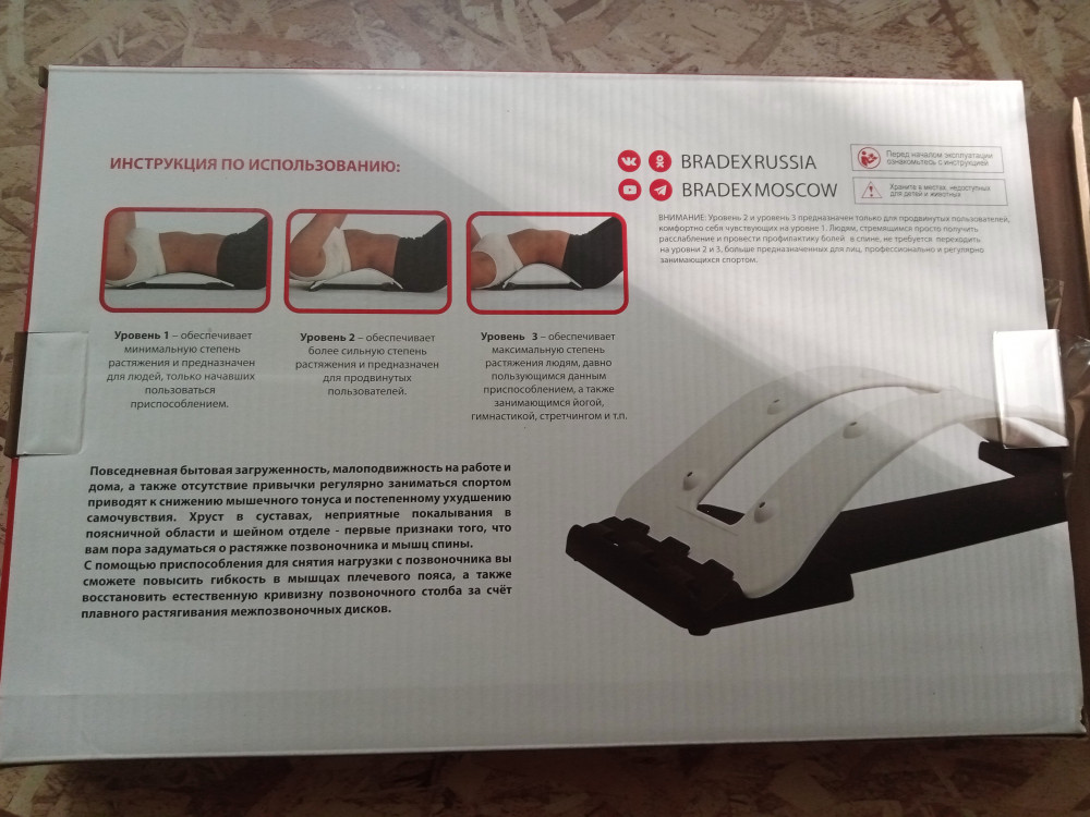 Мостик упакован в хороший картон, внутри дополнительно в прозрачный пакет. Имеет инструкцию по сборке и использованию. Магниты настоящие, проверила, собрала быстро. Для начала 1 уровень. Лежать удобно, мышцы и позвоночник действительно растягиваются. Единственный минус - не написан максимальный вес. Рекомендую