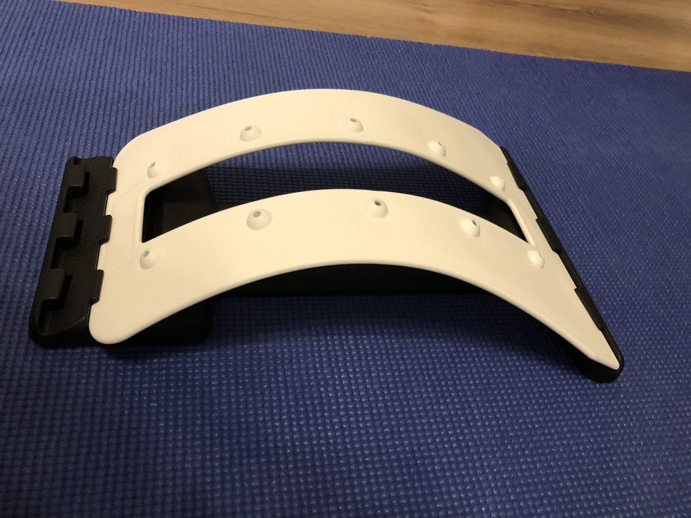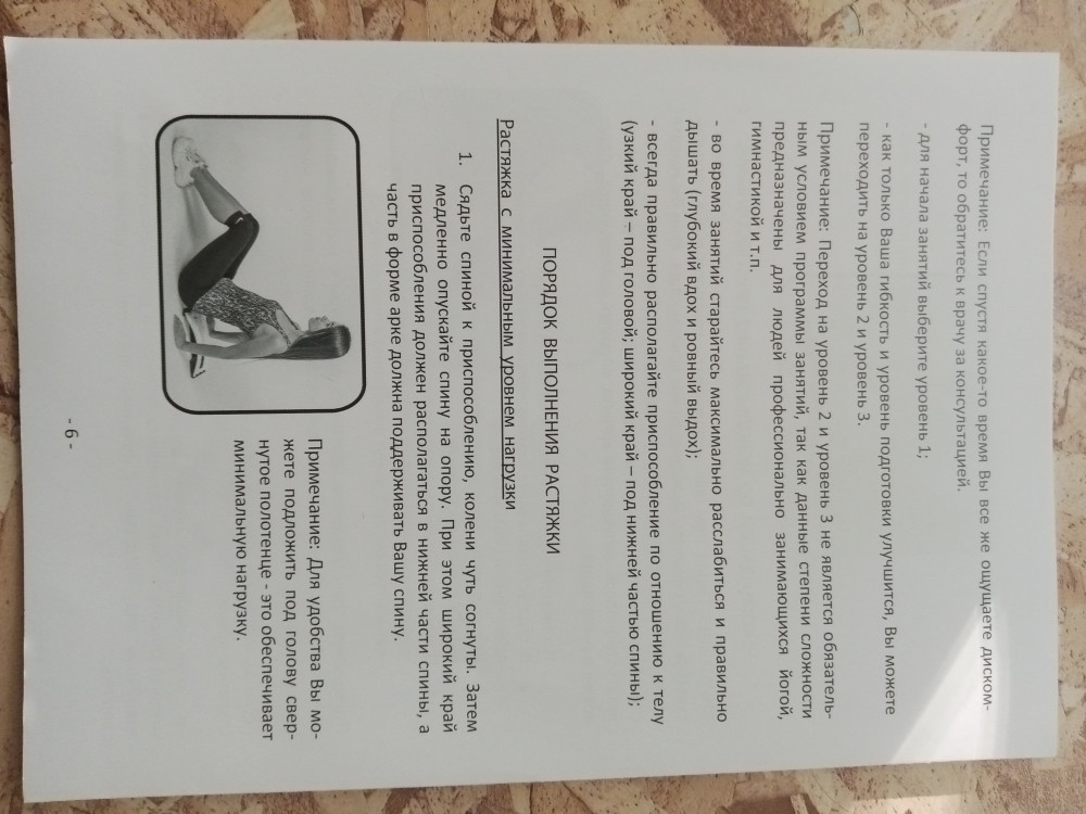 Хороший,прочный мостик. Растягивает позвоночник, убирает скованность. Начинать нужно с первой позиции, не торопиться переставлять на вторую. Упаковка отличная, можно и в подарок.