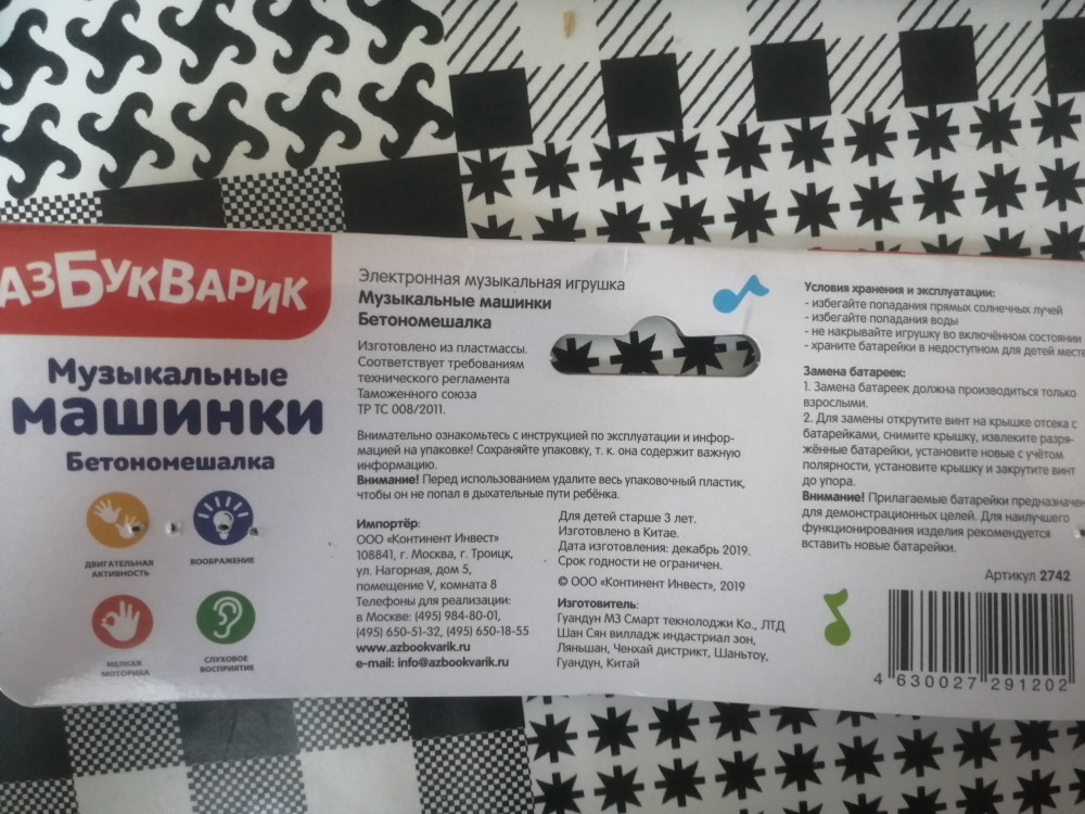 Машинка хорошая: яркая, инерционная, мигает, песенку проигрывает. Внуку, думаю, понравится. Но снимаю звезду за то, что заявлено: изготовитель Россия, а на упаковке: Китай.