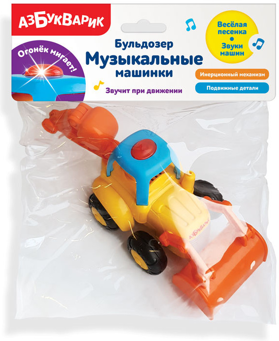 Азбукварик БульдозерВ данный момент этот товар отсутствует в продаже. Возможно, у нас найдется аналогичный или похожий товар здесь. Серия: Музыкальные машинки Забавный разноцветный бульдозер ездит, мигает огоньками, проигрывает веселую песенку и задорно «бибикает». Музыка и световые эффекты включаются при движении, а слова песенки помогут крохе быстро выучить счет до пяти. Поставьте игрушку на пол, включите, и ребенок будет с большим удовольствием ползать за веселой машинкой, которая ездит благодаря работе инерционного механизма. У бульдозера есть подвижные детали — малыш это обязательно оценит! |