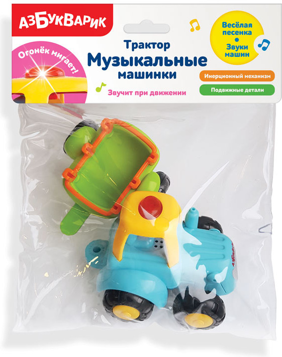 Азбукварик ТракторВ данный момент этот товар отсутствует в продаже. Возможно, у нас найдется аналогичный или похожий товар здесь. Серия: Музыкальные машинки Забавный разноцветный трактор ездит, мигает огоньками, проигрывает веселую песенку и задорно «бибикает». Музыка и световые эффекты включаются при движении, а слова песенки помогут крохе быстро выучить счет до пяти. Поставьте игрушку на пол, включите, и ребенок будет с большим удовольствием ползать за веселой машинкой, которая ездит благодаря работе инерционного механизма. У самосвала есть съемный прицеп — малыш это обязательно оценит! |