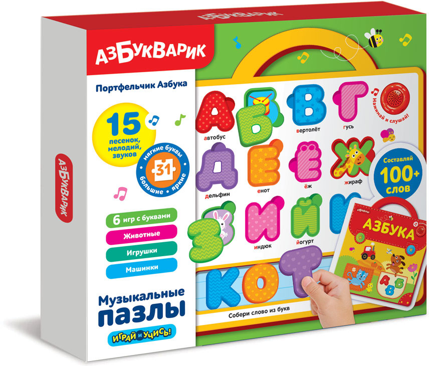 Азбукварик Пазл музыкальный «Азбука»В данный момент этот товар отсутствует в продаже. Возможно, у нас найдется аналогичный или похожий товар здесь. Серия: Музыкальные пазлы С таким портфельчиком дошкольник поскорей захочет пойти в первый класс! Портфельчик стильный, яркий, из легкого материала EVA, а самое главное — в нем есть все необходимые знания. Это настоящая касса букв — как у первоклассника! Большие вкладыши — это буквы, а в окошках под ними — картинки и слова. |