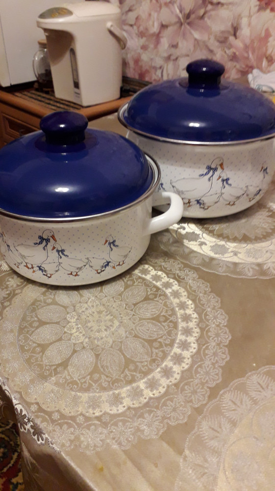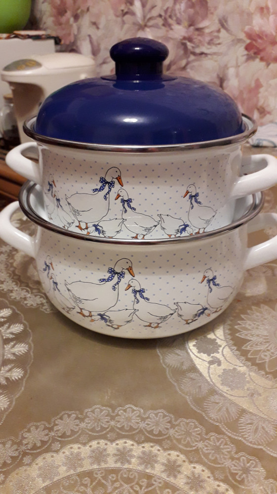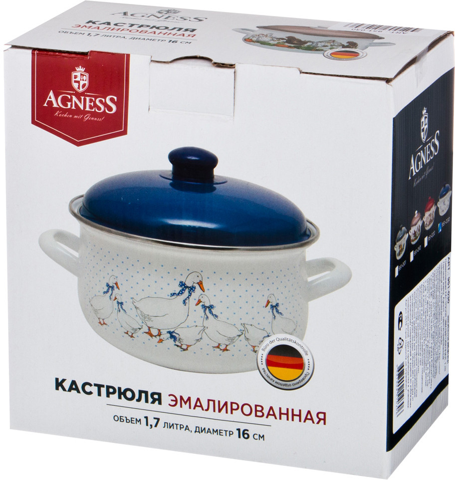 Кастрюли симпатичные, аккуратно упакованные, впрочем, как и другие этой фирмы. Крышка в плёнке, вложена в кастрюлю и все запаяно в толстую плёнку, затем в коробку. Вероятность повреждения при транспортировке нулевая. Все продумано производителем. Покупала на 2,4 и 1,5 литра. Для маленькой кастрюли есть дополнительно пластиковая крышка. Эмаль у посуды белая, ровная. Рисунок двухсторонний. Инструкция по эксплуатации прилагается. Одно удовольствие готовить, особенно молочное, мыть тем более. Простенько и со вкусом.