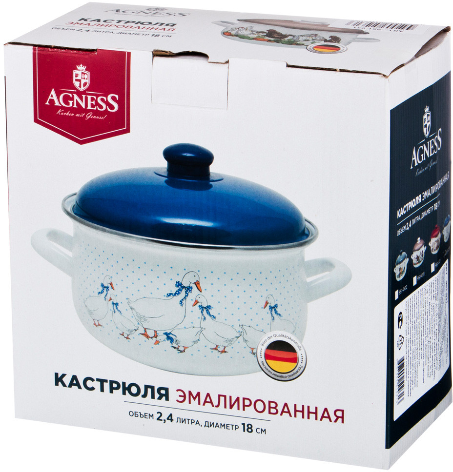 Кастрюли симпатичные, аккуратно упакованные, впрочем, как и другие этой фирмы. Крышка в плёнке, вложена в кастрюлю и все запаяно в толстую плёнку, затем в коробку. Вероятность повреждения при транспортировке нулевая. Все продумано производителем. Покупала на 2,4 и 1,5 литра. Для маленькой кастрюли есть дополнительно пластиковая крышка. Эмаль у посуды белая, ровная. Рисунок двухсторонний. Инструкция по эксплуатации прилагается. Одно удовольствие готовить, особенно молочное, мыть тем более. Простенько и со вкусом.