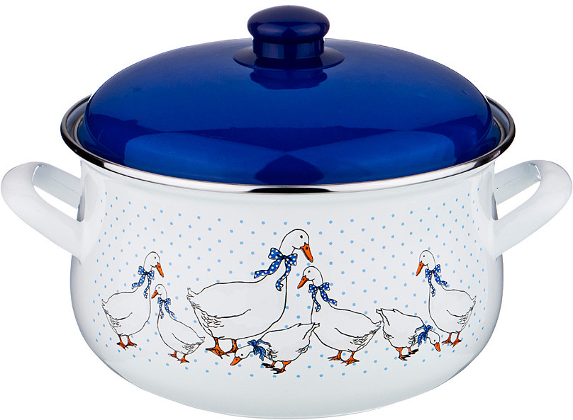 Кастрюли симпатичные, аккуратно упакованные, впрочем, как и другие этой фирмы. Крышка в плёнке, вложена в кастрюлю и все запаяно в толстую плёнку, затем в коробку. Вероятность повреждения при транспортировке нулевая. Все продумано производителем. Покупала на 2,4 и 1,5 литра. Для маленькой кастрюли есть дополнительно пластиковая крышка. Эмаль у посуды белая, ровная. Рисунок двухсторонний. Инструкция по эксплуатации прилагается. Одно удовольствие готовить, особенно молочное, мыть тем более. Простенько и со вкусом.
