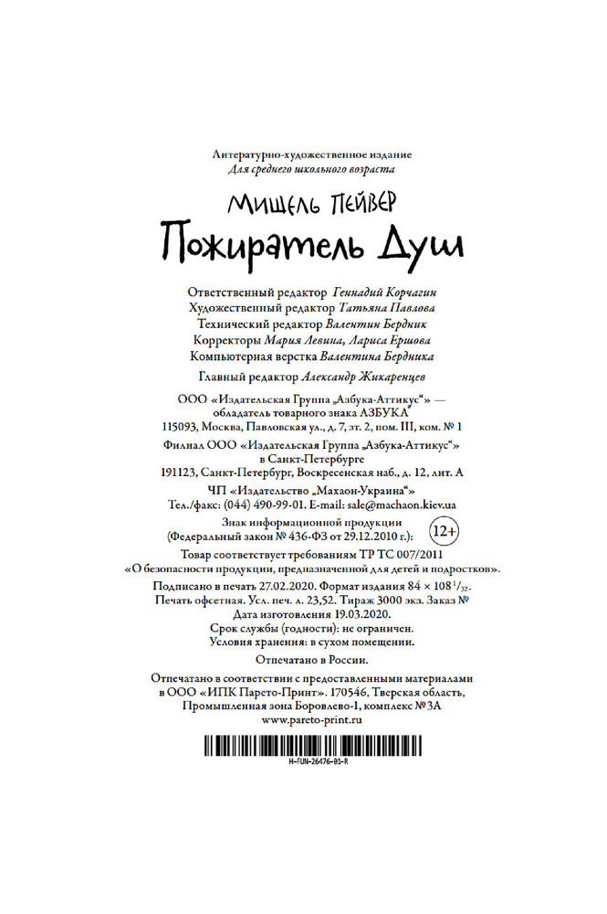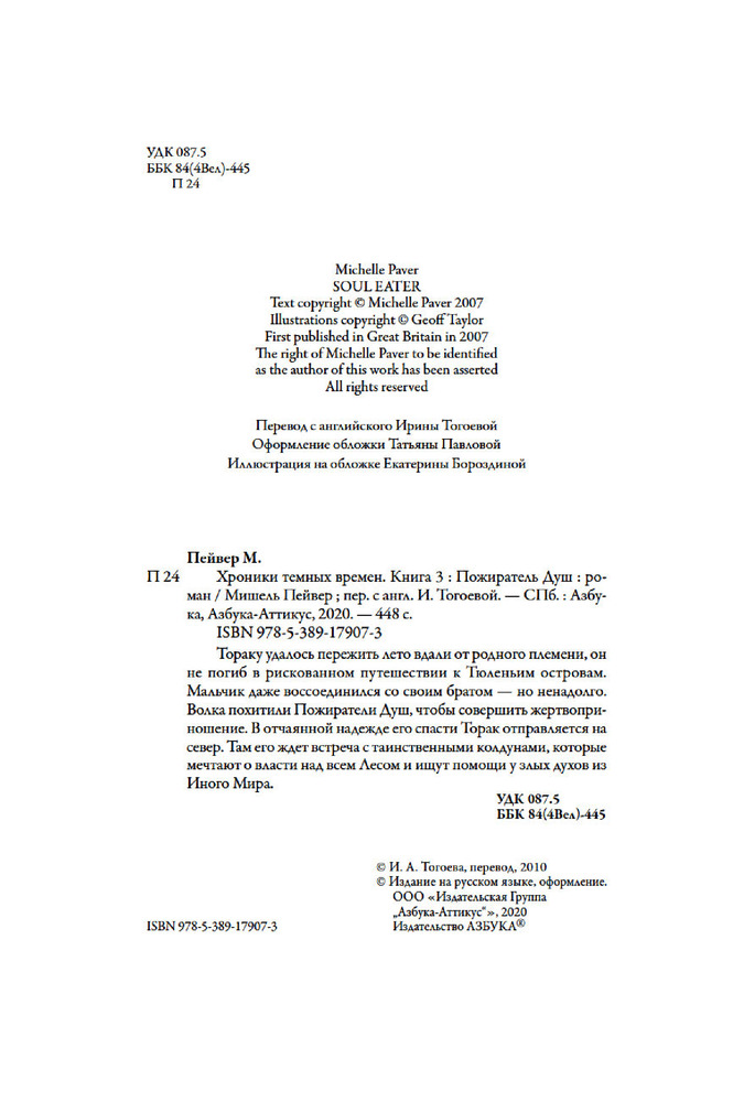 Хроники темных времен. Книга 3. Пожиратель ДушВ данный момент этот товар отсутствует в продаже. Возможно, у нас найдется аналогичный или похожий товар здесь. Серия: Чернильное сердце Тораку удалось пережить лето вдали от родного племени, он не погиб в рискованном путешествии к Тюленьим островам. Мальчик даже воссоединился со своим братом — но ненадолго. Волка похитили Пожиратели Душ, чтобы совершить жертвоприношение. В отчаянной надежде его спасти Торак отправляется на север. Там его ждет встреча с таинственными колдунами, которые мечтают о власти над всем Лесом и ищут помощи у злых духов из Иного Мира. |