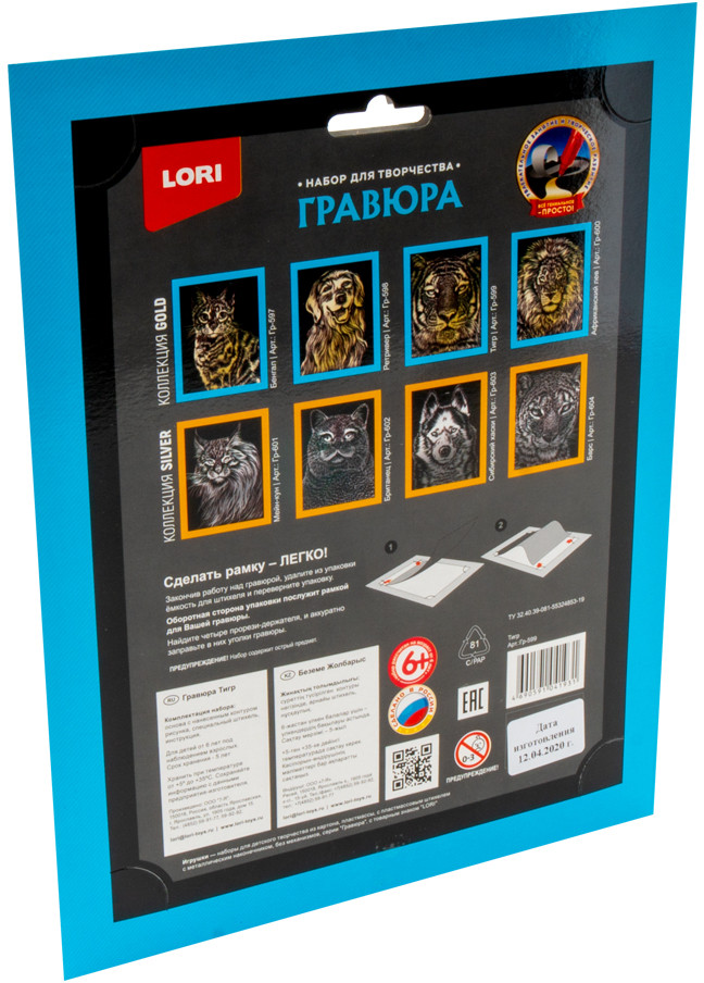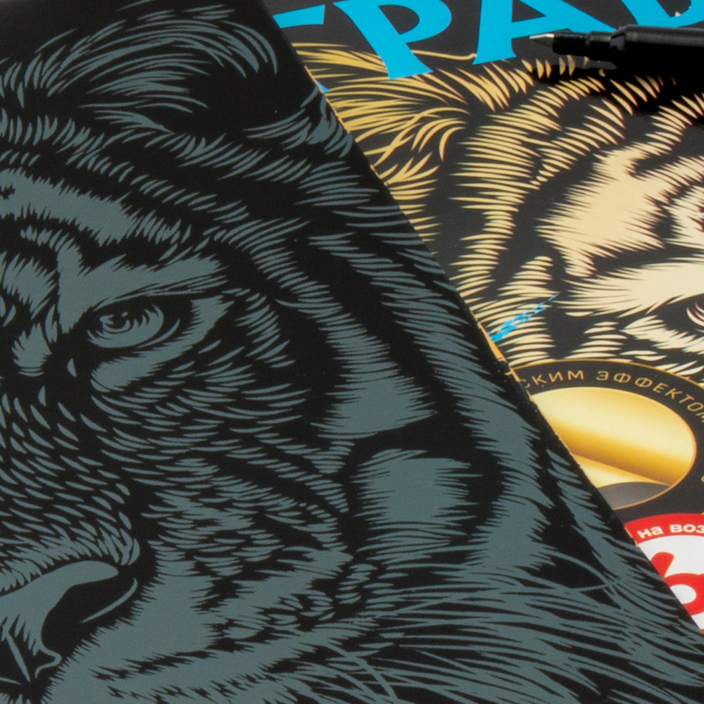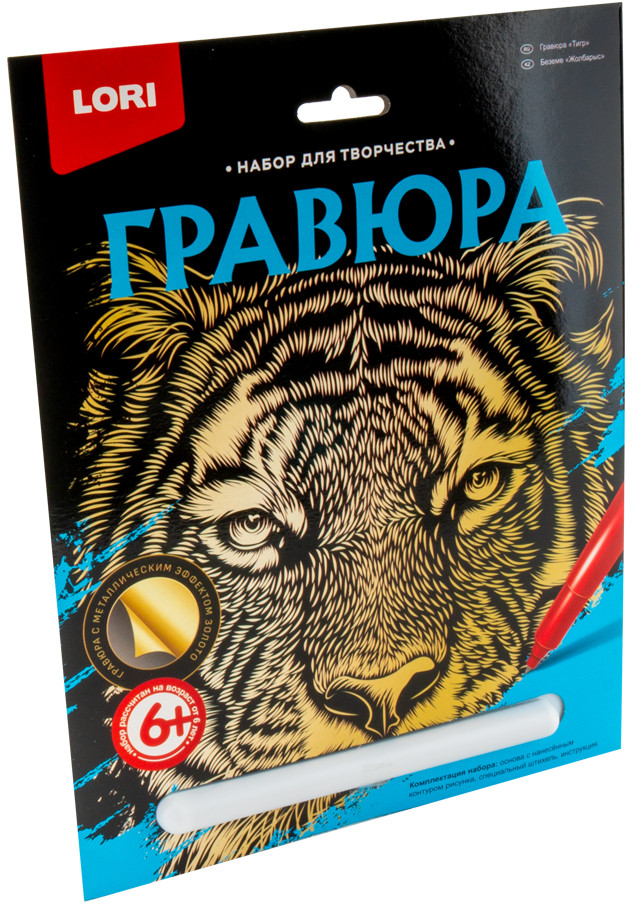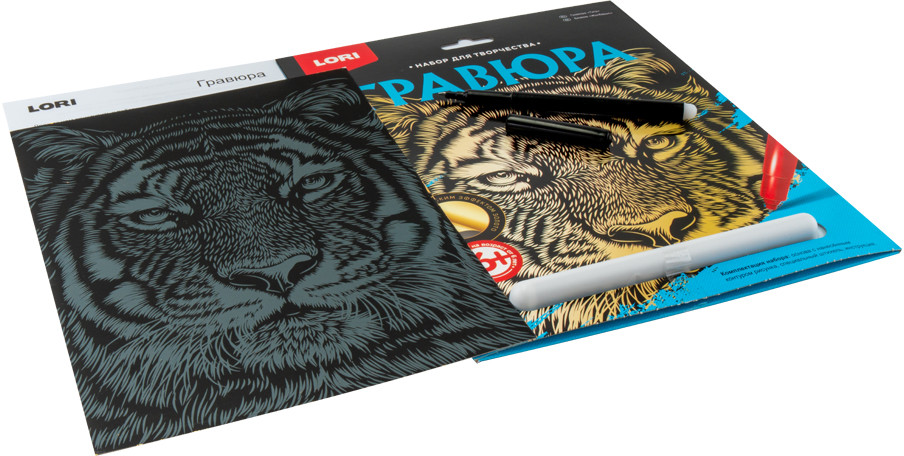 Гравюра — особый вид графического искусства. С гравюрой ребёнок может самостоятельно создать настоящее произведение искусства и почувствовать себя гравером. Контур изображения уже нанесен на черный фон. С помощью штихеля изображение процарапывается по контуру, и из-под слоя краски появляется блестящая основа. В результате получается контрастный рисунок с эффектным изображением.