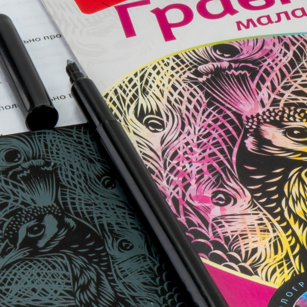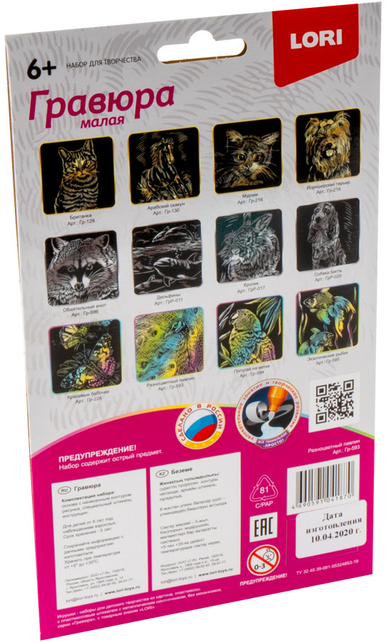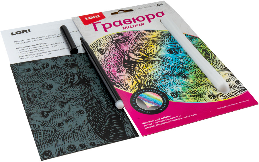 Lori Гравюра «Разноцветный павлин»В данный момент этот товар отсутствует в продаже. Возможно, у нас найдется аналогичный или похожий товар здесь. Гравюра — особый вид графического искусства. С гравюрой ребёнок может самостоятельно создать настоящее произведение искусства и почувствовать себя гравером. Контур изображения уже нанесен на черный фон. С помощью штихеля изображение процарапывается по контуру, и из-под слоя краски появляется блестящая основа. В результате получается контрастный рисунок с эффектным изображением. |