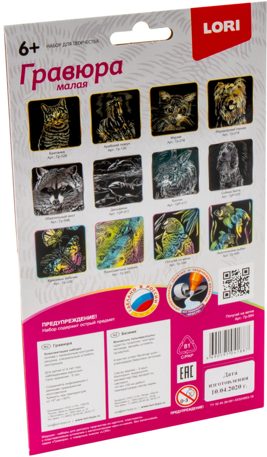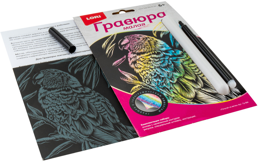 Lori Гравюра «Попугай на ветке»В данный момент этот товар отсутствует в продаже. Возможно, у нас найдется аналогичный или похожий товар здесь. Гравюра — особый вид графического искусства. С гравюрой ребёнок может самостоятельно создать настоящее произведение искусства и почувствовать себя гравером. Контур изображения уже нанесен на черный фон. С помощью штихеля изображение процарапывается по контуру, и из-под слоя краски появляется блестящая основа. В результате получается контрастный рисунок с эффектным изображением. |