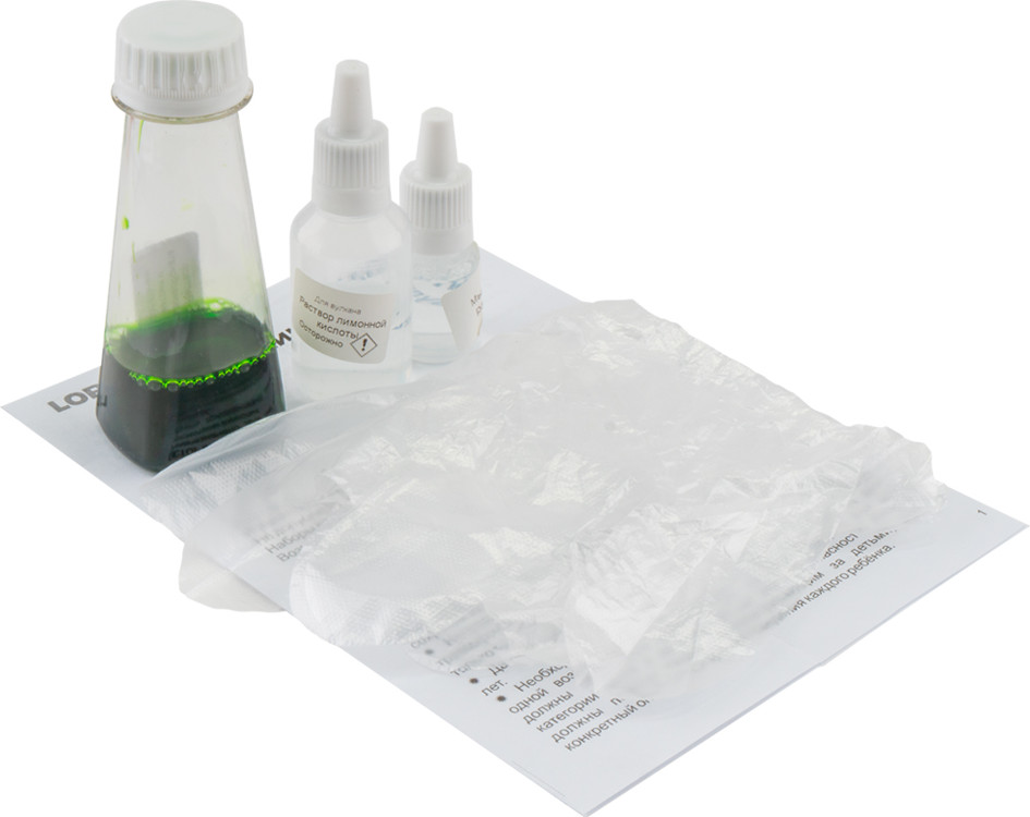 В комплектации: раствор карбамида и поливинилового спирта с красителем, поддон для выращивания,картонная основа, декоративный картонный элемент, инструкция.