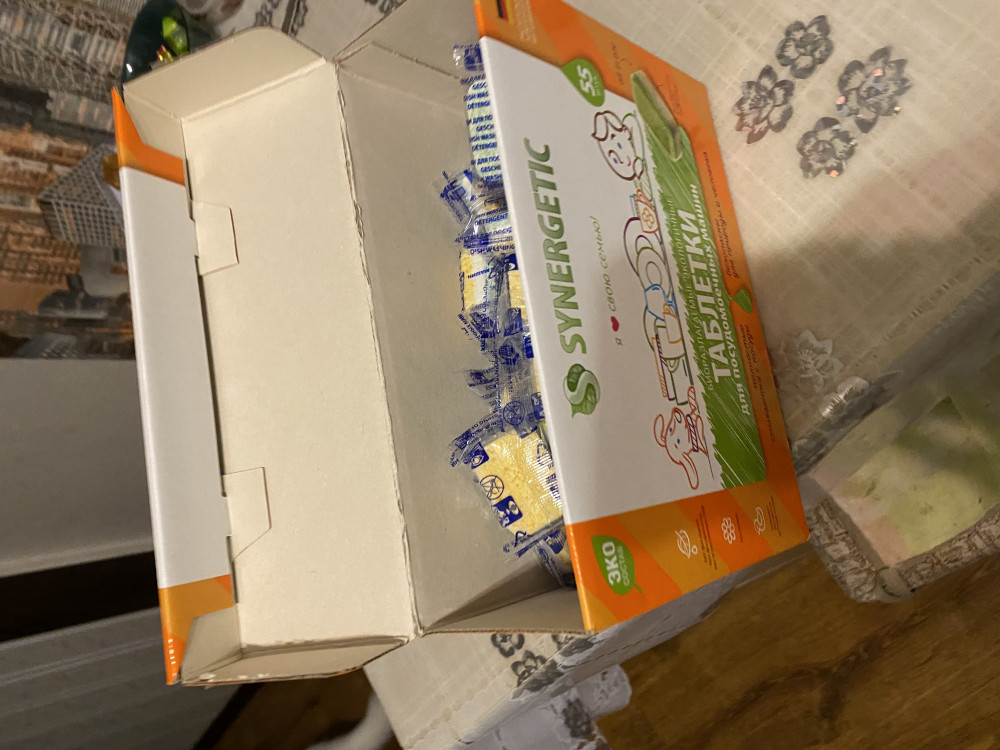 После использования таблеток посуда не блестит,а какая-то мутная. Отмывает хуже, чем Финиш. Но у Финиш очень агреманый состав. Так как сама аллергик и в доме малыш, то перешла недавно на Синергетик- безопасный состав, хорошо отмывает, пока нравится.