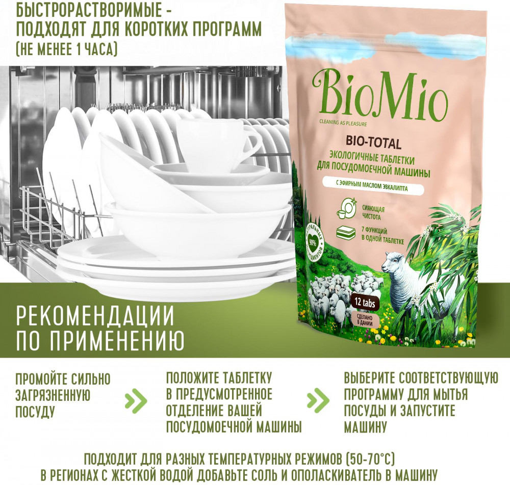 BioMio Таблетки для посудомоечных машин с маслом эвкалиптаВ данный момент этот товар отсутствует в продаже. Возможно, у нас найдется аналогичный или похожий товар здесь. Таблетки Bio-Total для чистки посуды в посудомоечной машине из натуральных компонентов хорошо удаляют жирные разводы, пригоревшую еду и другие загрязнения. Могут использоваться даже при низких температурах. Придают посуде дополнительный блеск, а также эффективно убирают все неприятные запахи. Такие таблетки препятствуют появлению известкового налета в посудомоечной машине и смягчают воду. |