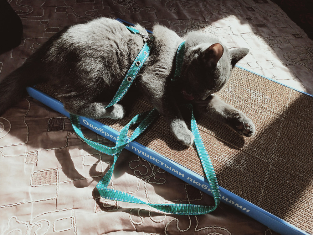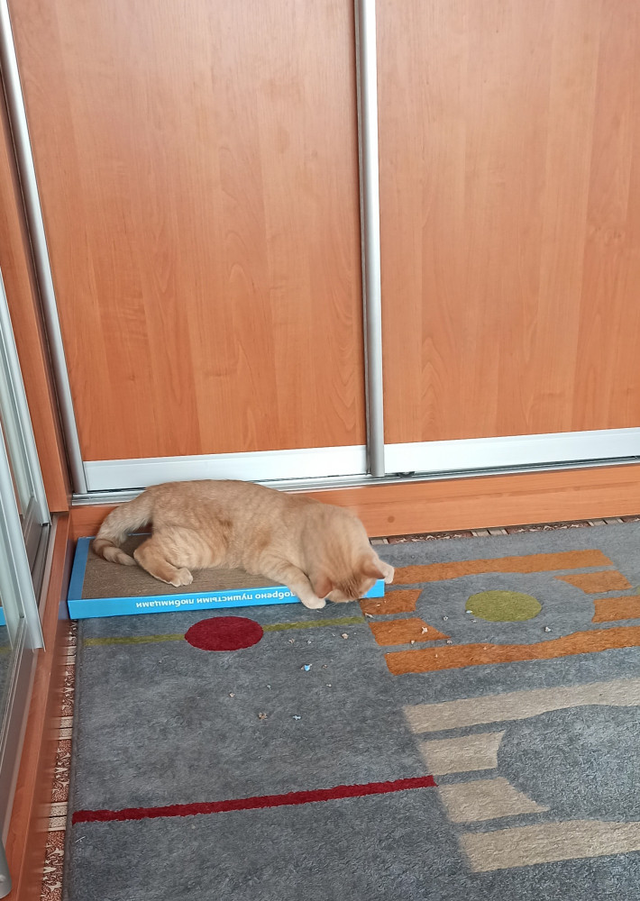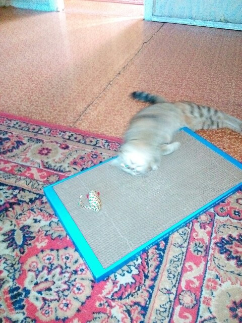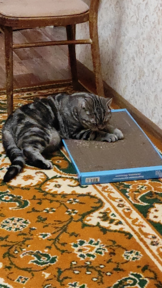 Когтедралка просто покорила нашу кисуню! Уже три часа не отходит 😀. Облизывает её, дерет, потом просто лежит... и снова всё манипуляции по-кругу)