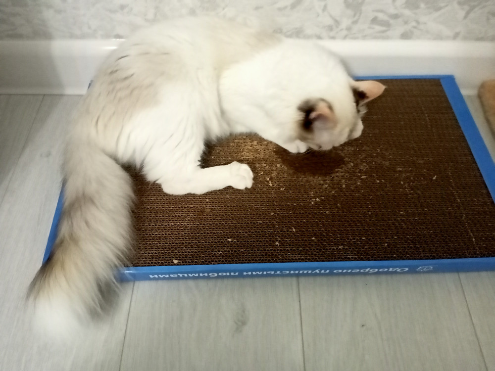 Просто отличная когтеточка - большая, крепкая. Это наша четвертая когтеточка и кот всегда по назначению использует - и для когтей и спит на них. В этот раз мята пришла какая-то особенная))) обычно не реагировал на мяту,а тут весь вечер нюхал и драл когти,пытался вытащить. Цена вообще сказка, мы очень довольны покупкой.