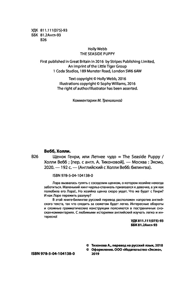 В данный момент этот товар отсутствует в продаже. Возможно, у нас найдется аналогичный или похожий товар здесь. Серия: Английский с Холли Вебб: билингва Лора вызвалась гулять с соседским щенком, о котором хозяйке некогда заботиться. Маленький кинг-чарльз-спаниель привязался к девочке, а уж как полюбила его Лора! Но хозяйка щенка скоро уедет. Что же будет с Генри? И как Лоре пережить разлуку?