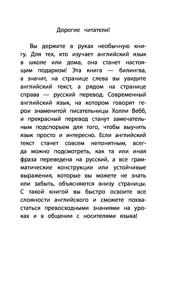 В этой книге-билингве русский перевод расположен напротив английского текста, так что следить за сюжетом будет легко. Интересные обороты и сложные грамматические конструкции поясняются в постраничных сносках-комментариях. С любимыми историями английский изучать легко и интересно! |