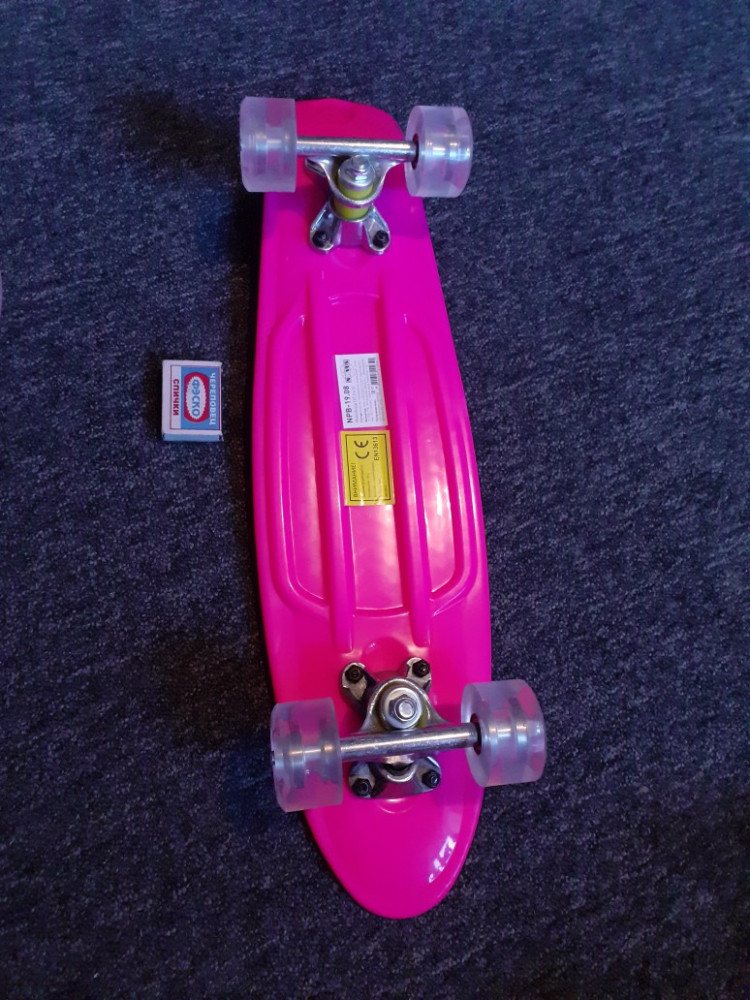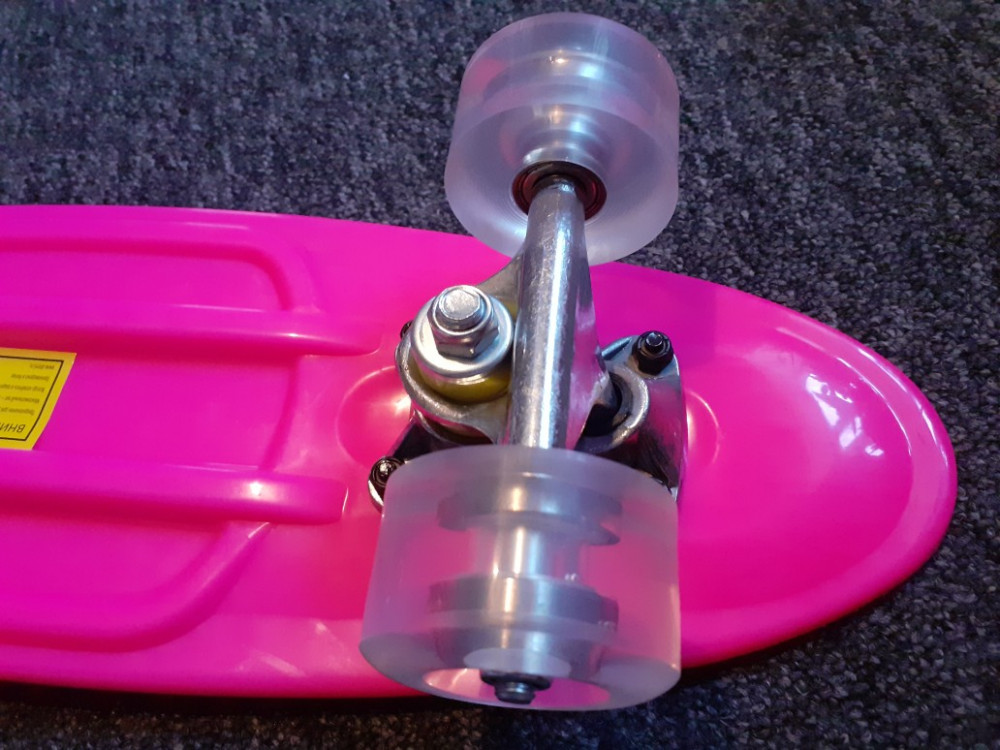 Хороший пластик . Колёса прозрачные . Бесшумный .пластик слегка гнётся на пикниках , это амортизация для трюков . Дочке 12 лет, понравился .