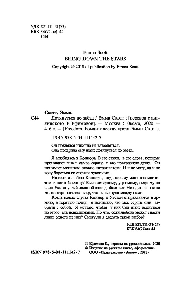 "Дотянуться до звезд" Э. Скотт - книга в отличном красивом переплёте, страницы белые, шрифт хороший. Содержание не вполне соответствует нашему менталитету. Много в отношениях интимной "свободы", что не вполне приемлемо. Впечатление, что студенты только тем и заняты, что бегать по вечеринкам сомнительного содержания и заниматься сексом место учёбы. Может, конечно, я "синий чулок" (старорежимная). Поэтому мне не понятны "страдания" героини, которую бросил парень после двух лет совместной "свободной" жизни. А чего бы она хотела?! На таких не женятся. Книга не понравилась.