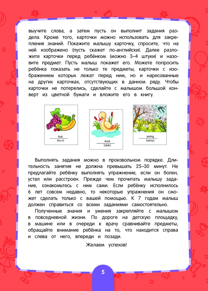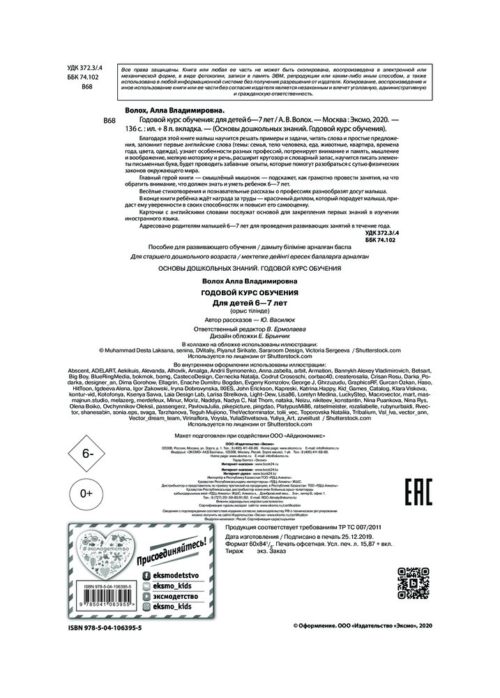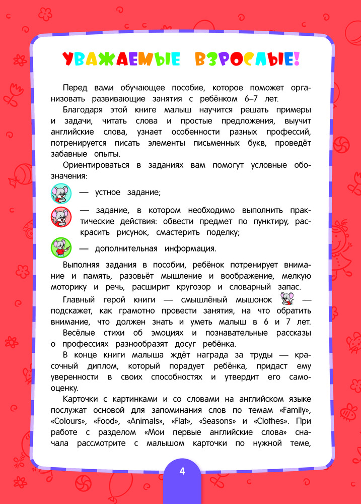 💳 Оплатить за товар можно при получении 🇰🇿 Есть бесплатная доставка по Казахстану 🎁 Копите бонусы с каждой покупки Серия: Основы дошкольных знаний. Годовой курс обучения (с карточками) Благодаря этой книге малыш научится решать примеры и задачи, читать слова и простые предложения, запомнит первые английские слова (темы: семья, тело человека, еда, животные, квартира, времена года, цвета, одежда), узнает особенности разных профессий, потренирует внимание и память, мышление и воображение, мелкую моторику и речь, расширит кругозор и словарный запас, научится писать элементы письменных букв, будет проводить забавные опыты, которые помогут разобраться с сутью физических законов окружающего мира. |