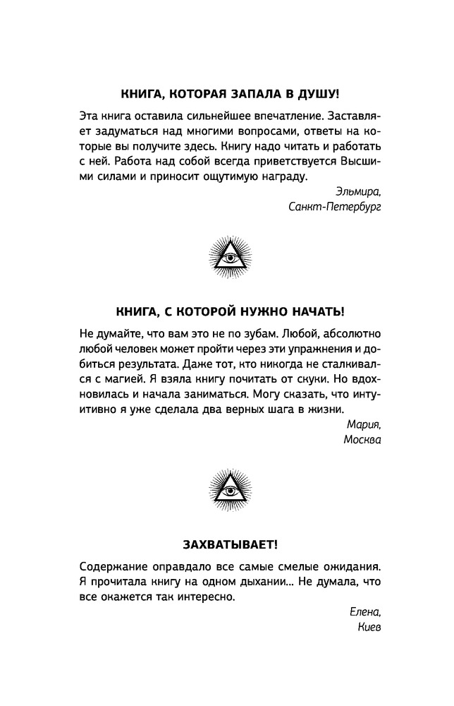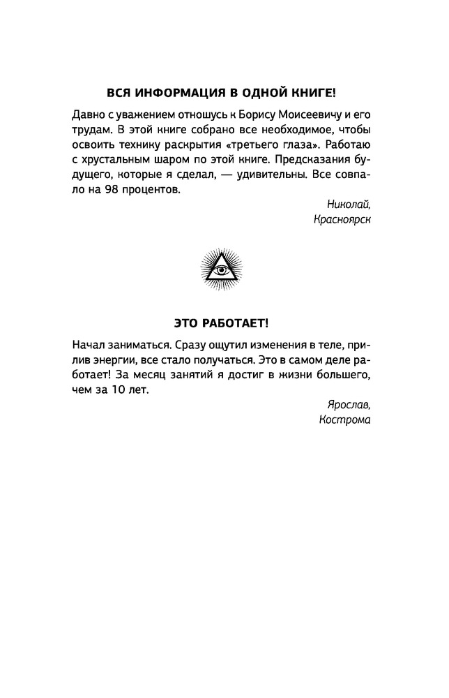 💳 Оплатить за товар можно при получении 🇰🇿 Есть бесплатная доставка по Казахстану от 1 дня 🎁 Копите бонусы с каждой покупки Серия: Высший Разум Ясновидение — это способность видеть то, что недоступно для восприятия обычного человека, проникать в прошлое и будущее, читать мысли людей, видеть истинную подоплеку событий в настоящем. Многие люди хотели бы обладать этим даром, но им кажется, что он доступен лишь избранным. Маг, создатель уникальной методики работы с энергетикой Борис Моносов считает, что такая способность есть у каждого, просто мы не знаем, как ею пользоваться. Одиннадцать разделов книги посвящены практикам последовательной подготовки к открытию способности видения, открытию «третьего глаза», способности «читать» ауры, настройке на вещие сны. Эти упражнения помогут вам отточить интуицию, открыть тайны подсознания, перейти на новый уровень мышления! |
