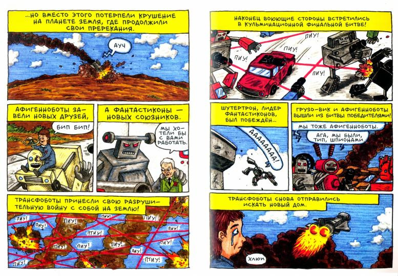 💳 Оплатить за товар можно при получении 🇰🇿 Есть бесплатная доставка по Казахстану от 1 дня 🎁 Копите бонусы с каждой покупки Серия: Комильфо. КомФедерация. Зарубежные комиксы Три года назад на Землю прилетела воинствующая инопланетная раса роботов, которая разделилась на две соперничающие группы — Офигенноботов и Фантастиконов. После продолжительной войны и потери нескольких лучевых пушек обе стороны покинули нашу планету. Но кое-кого они оставили на Земле: Шутертрон, хитрый лидер злых Фантастиконов, который оказался жив! К счастью для землян, память Шутертрона немного расплывчата. К несчастью для землян, остальные Невероятные трансфоботы решили вернуться за злодеем, чтобы поставить точку в борьбе воинственных роботизированных рас! |