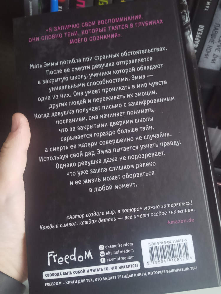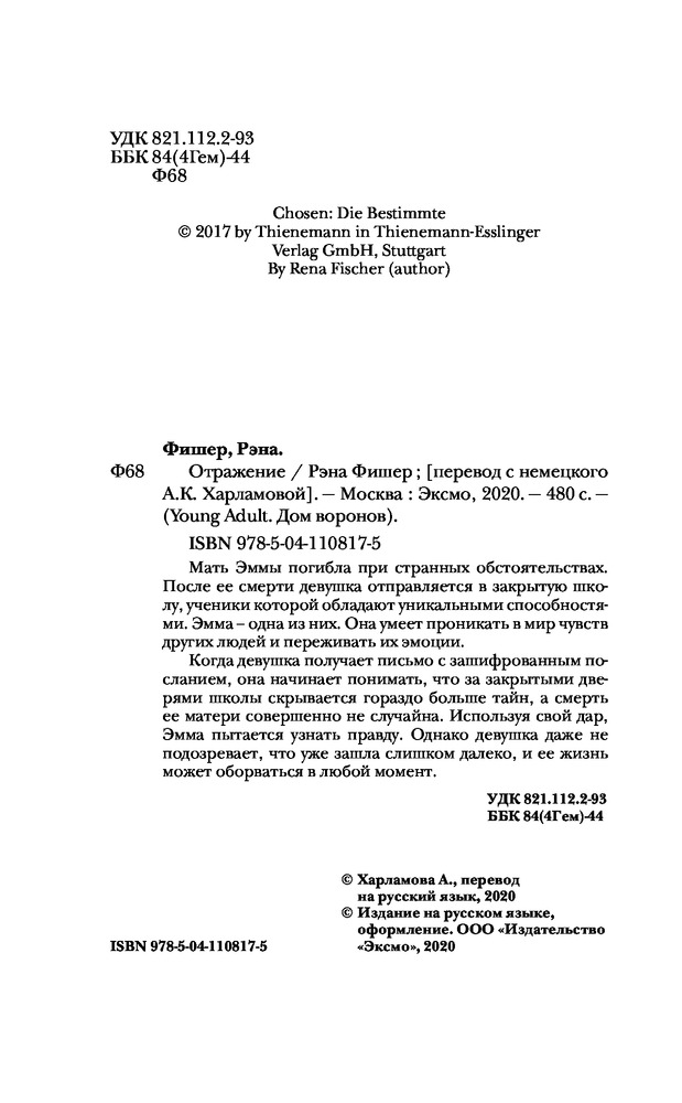ОтражениеВ данный момент этот товар отсутствует в продаже. Возможно, у нас найдется аналогичный или похожий товар здесь. Серия: Young Adult. Дом воронов Мать Эммы погибла при странных обстоятельствах. После ее смерти девушка отправляется в закрытую школу, ученики которой обладают уникальными способностями. Эмма — одна из них. Она умеет проникать в мир чувств других людей и переживать их эмоции. |