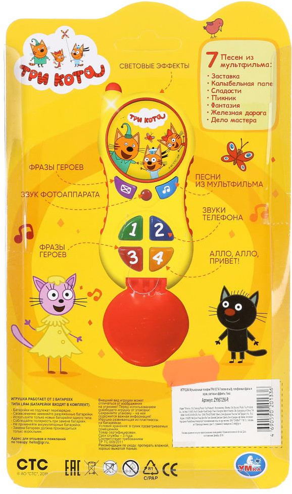 УМка Телефон музыкальныйВ данный момент этот товар отсутствует в продаже. Возможно, у нас найдется аналогичный или похожий товар здесь. Серия: Три кота Музыкальный телефон — без сомнения понравится малышу и подойдёт для развития творческих способностей ребёнка. Яркий телефончик оснащён разноцветными кнопочками разной формы. Яркий дизайн с изображением героев мультфильма будет радовать малыша, а песенки, стихи и многочисленные функции увлекут в игровой процесс. Благодаря компактным размерам игрушку удобно брать с собой на прогулку, в гости или в поездки. |