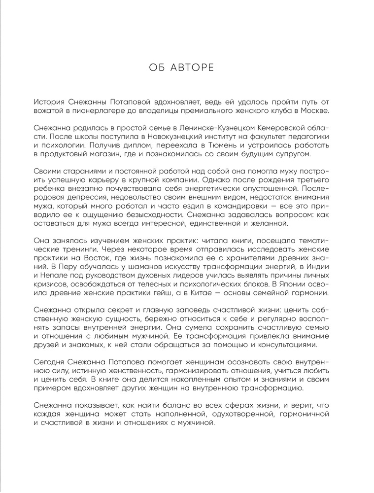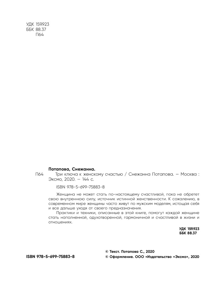 Три ключа к женскому счастью. Как раскрыть источник женской силы и стать счастливой в жизни, семье и отношенияхВ данный момент этот товар отсутствует в продаже. Возможно, у нас найдется аналогичный или похожий товар здесь. Серия: Истории о жизни и счастье Женщина не может стать по-настоящему счастливой, пока не обретет свою внутреннюю силу, источник истинной женственности. К сожалению, в современном мире женщины часто живут по мужским моделям, истощая себя и все дальше уходя от своего предназначения. |