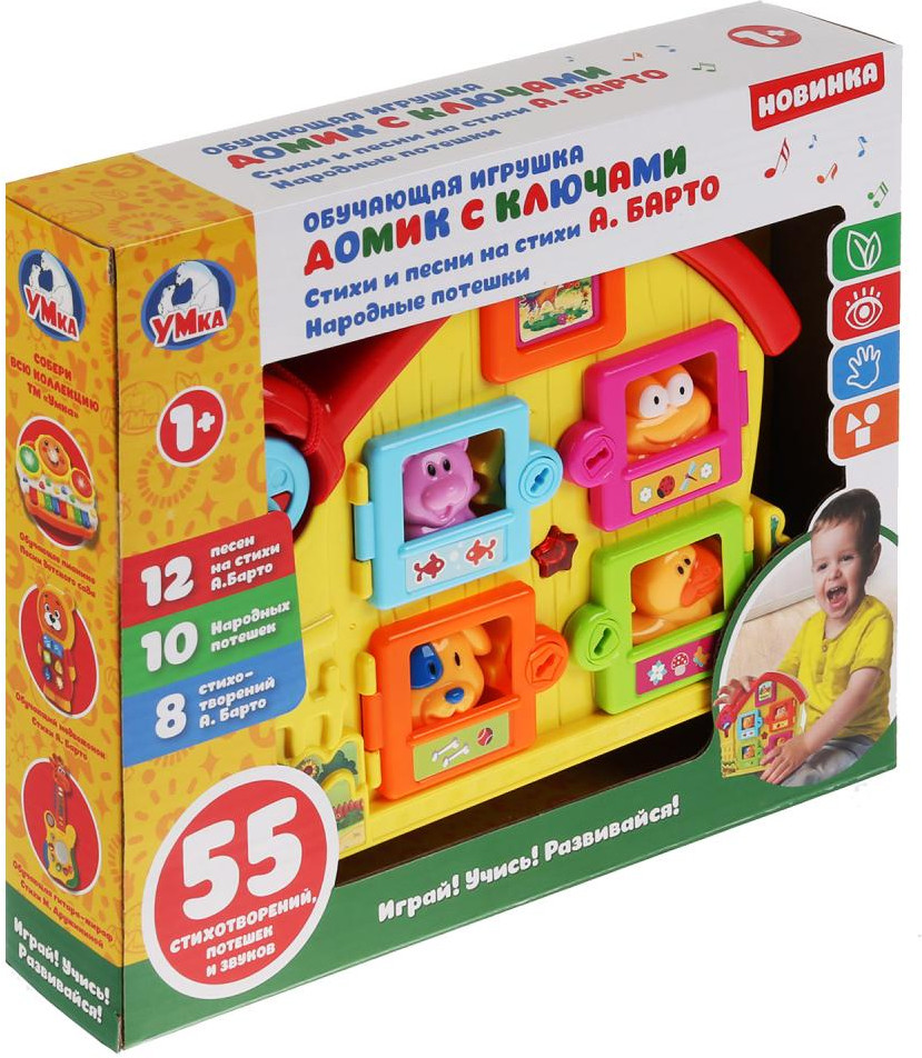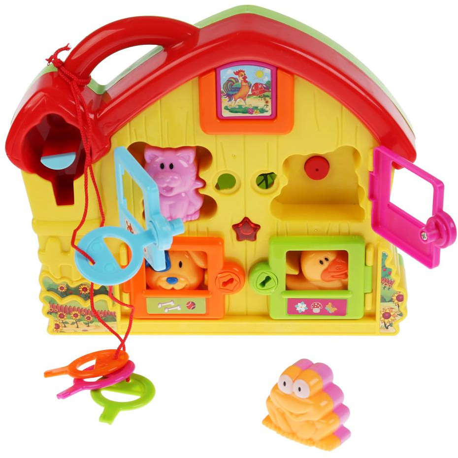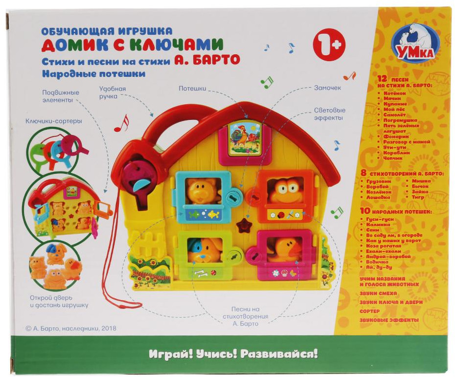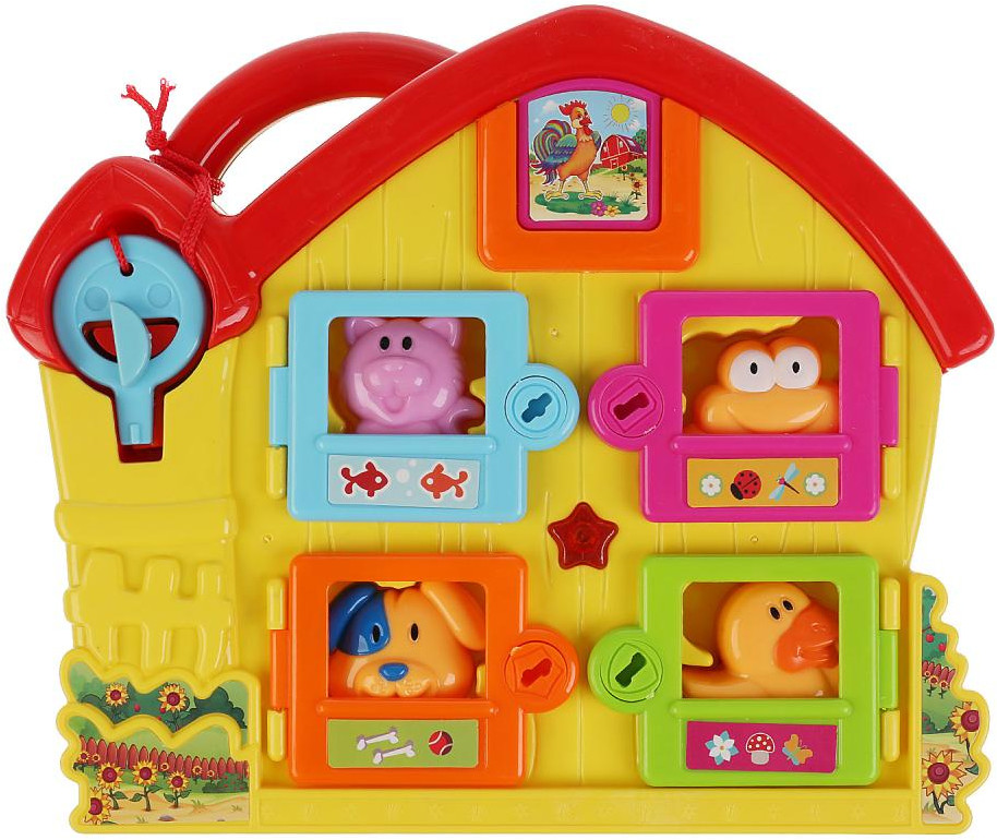 Играя, малыш сможет расставить фигурки животных в их домики, предварительно открыв каждую дверь своим ключом. Песенки, потешки, звуки, световые эффекты и множество интересных функций увлекут малыша и поднимут ему настроение. Благодаря удобной ручке игрушку удобно брать с собой на прогулку или в поездки.