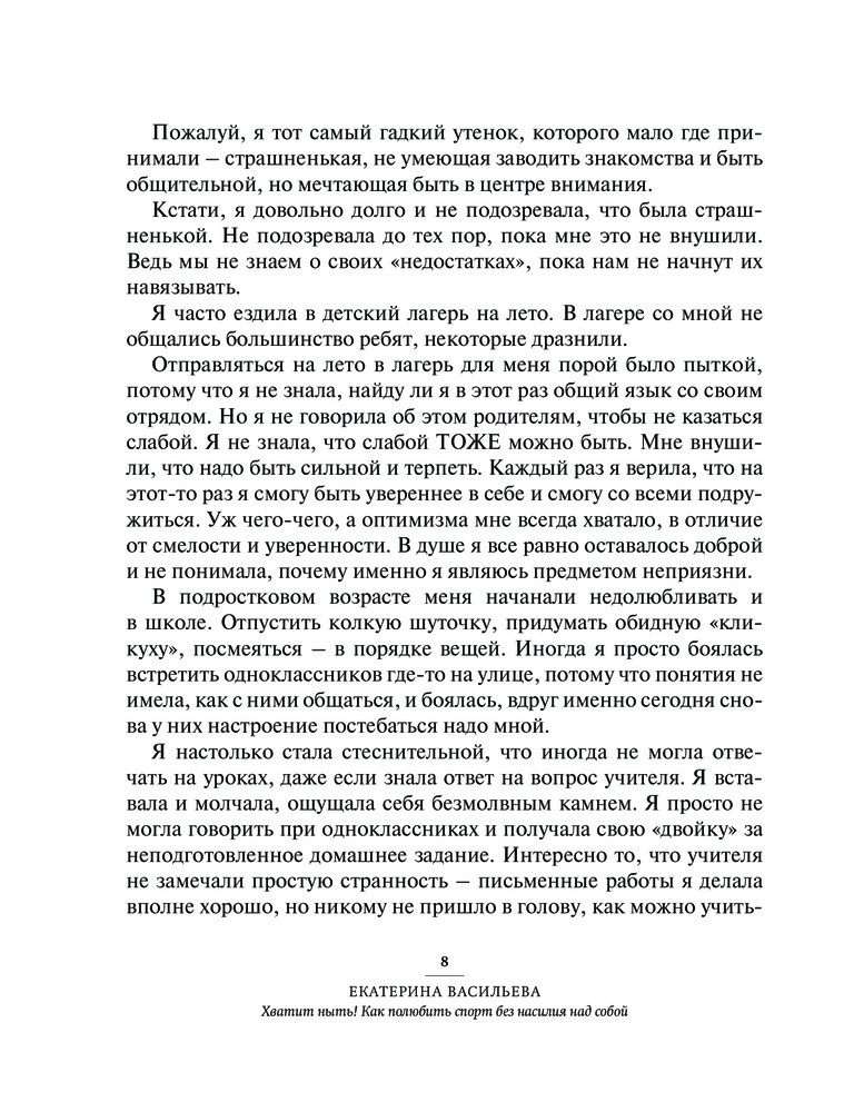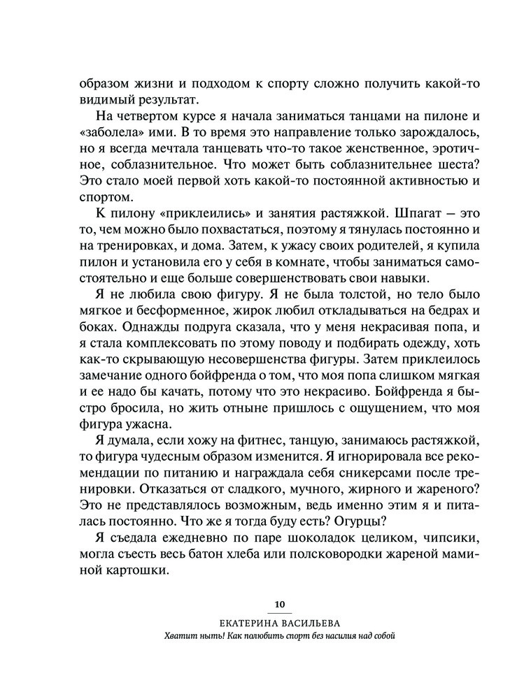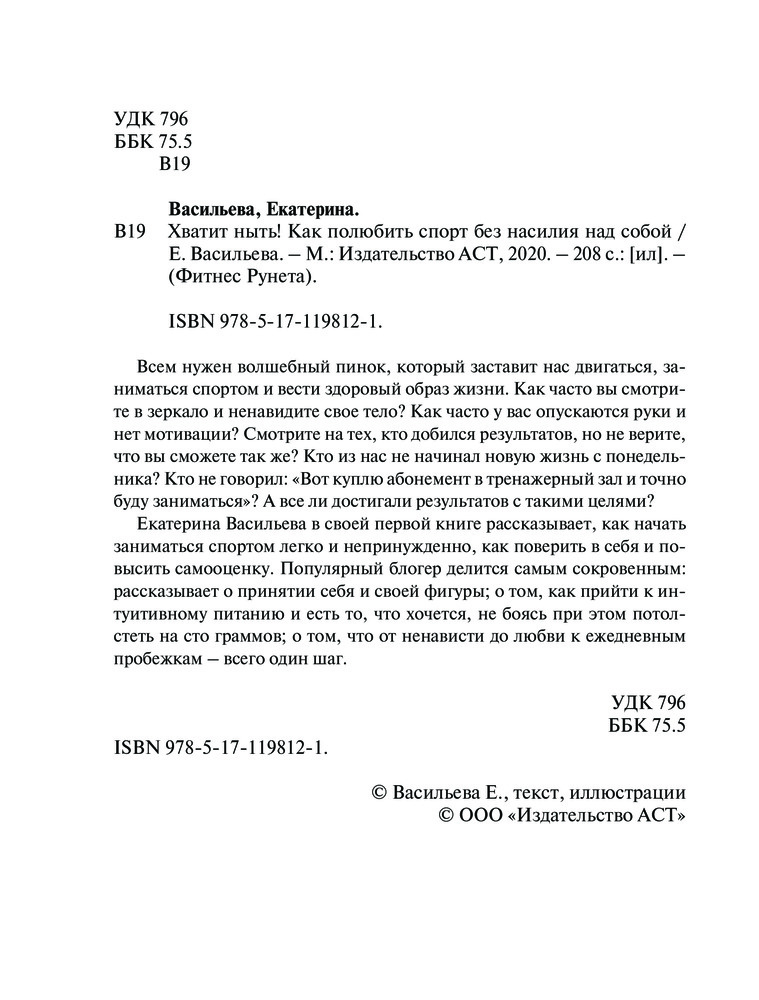 💳 Оплатить за товар можно при получении 🇰🇿 Есть бесплатная доставка по Казахстану от 1 дня 🎁 Копите бонусы с каждой покупки Серия: Фитнес Рунета Всем нужен волшебный пинок, который заставит нас двигаться, заниматься спортом и вести здоровый образ жизни. Как часто вы смотрите в зеркало и ненавидите своё тело? Как часто у вас опускаются руки и нет мотивации? Смотрите на тех, кто добился результатов, но не верите, что вы сможете так же? Кто из нас не начинал новую жизнь с понедельника? Кто не говорил: «Вот куплю абонемент в тренажерный зал и точно буду заниматься»? А все ли достигали результатов с такими целями? Екатерина Васильева в своей первой книге рассказывает, как начать заниматься спортом легко и непринужденно, как поверить в себя и повысить самооценку. Популярный блогер делится самым сокровенным: рассказывает о принятии себя и своей фигуры; о том, как прийти к интуитивному питанию и есть то, что хочется, не боясь при этом потолстеть на сто граммов; о том, что от ненависти до любви к ежедневным пробежкам — всего один шаг. |