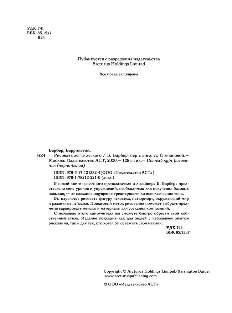 💳 Оплатить за товар можно при получении 🇰🇿 Есть бесплатная доставка по Казахстану от 1 дня 🎁 Копите бонусы с каждой покупки Серия: Полный курс рисования (черно-белая) Баррингтон Барбер является не только известным дизайнером, но и автором и иллюстратором более 50 книг и мастер-классов по основам рисования издательства Arcturus Publishing. Он рисует, рисует и пишет об искусстве. Его книги являются одними из самых популярных самоучителей по рисованию за рубежом и и в России. Баррингтон Барбер считает, что научиться рисовать несложно — все учатся ходить, говорить, читать и писать еще в раннем возрасте, а научиться рисовать еще проще! Рисование — это просто нанесение на бумагу штрихов, которые передают некоторый визуальный опыт. Все, что требуется для того, чтобы научиться хорошо рисовать — это желание, немного настойчивости, умение наблюдать и готовность потратить некоторое время на исправление ошибок. |