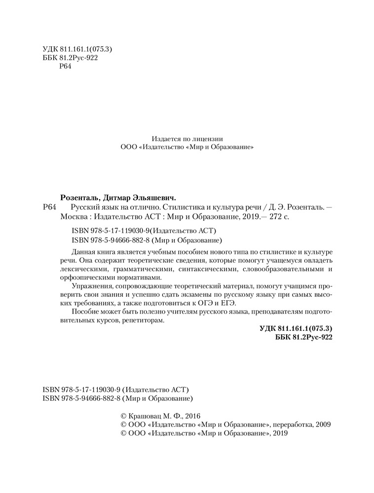 Русский язык на отлично. Стилистика и культура речиВ данный момент этот товар отсутствует в продаже. Возможно, у нас найдется аналогичный или похожий товар здесь. Серия: Розенталь. Русский язык на отлично Данная книга является учебным пособием нового типа по стилистике и культуре речи. Она содержит теоретические сведения, которые помогут учащемуся овладеть лексическими, грамматическими, синтаксическими, словообразовательными и орфоэпическими нормативами. |