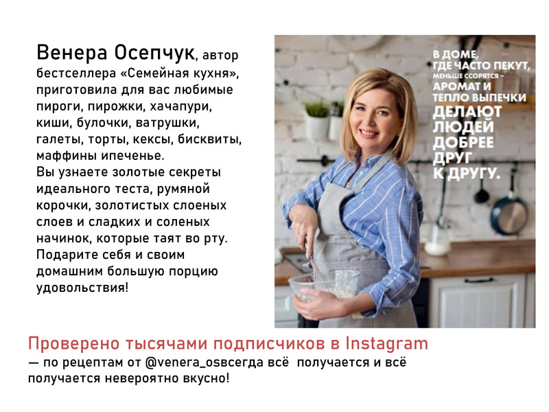 💳 Оплатить за товар можно при получении 🇰🇿 Есть бесплатная доставка по Казахстану от 1 дня 🎁 Копите бонусы с каждой покупки Серия: Приятного аппетита В доме, где часто пекут, меньше ссорятся — аромат и тепло выпечки делают людей добрее друг к другу. Венера Осепчук, автор бестселлера «Семейная кухня», приготовила для вас любимые пироги, пирожки, хачапури, киши, булочки, ватрушки, галеты, торты, кексы, бисквиты, маффины и печенье. Проверено тысячами подписчиков в Instagram — по рецептам от @venera_os всегда всё получается и всё получается невероятно вкусно! Вы узнаете золотые секреты идеального теста, румяной корочки, золотистых слоеных слоев и сладких и соленых начинок, которые таят во рту. Подарите себя и своим домашним большую порцию удовольствия! |