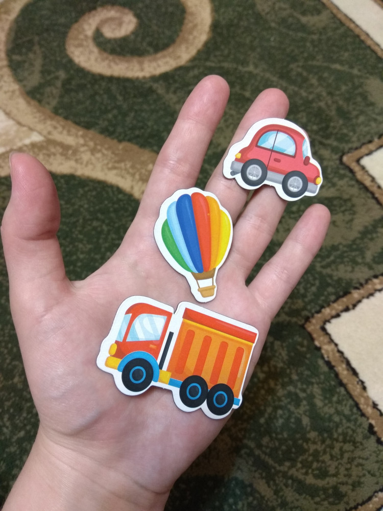 Яркий набор магнитов. Но единственное тонкие магниты. Не очень удобно отклеивать. Но ребёнку понравился набор. Все магниты очень яркие. И можно использовать как пазлы.