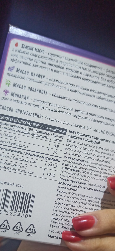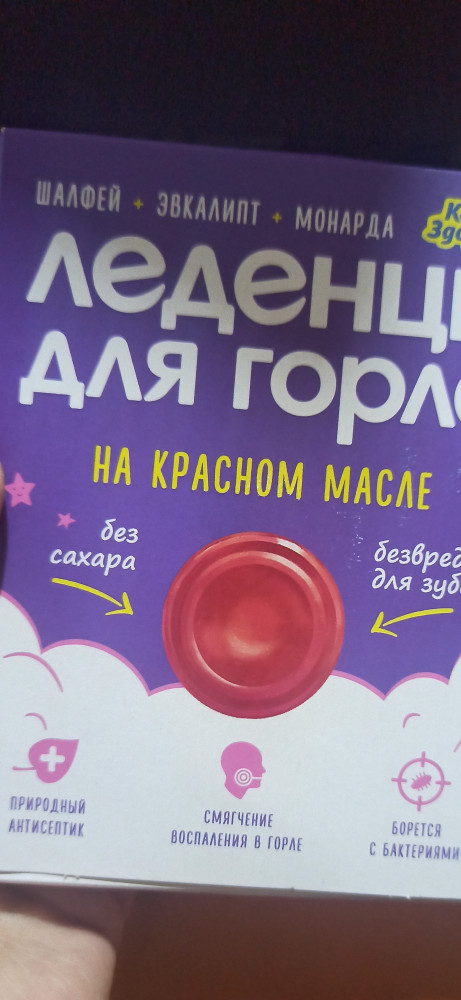 Леденцы - палочка-выручалочка! Не любитель леденцов для горла, но эти 👍🏻. Перепробовала разные - по вкусу (не приторные и не горчат), по эффективности и по цене очень приемлемые. Единственное, что может кому-то не понравиться, - красителем указан кармин. Хотя с учётом того, что содержится красное масло, можно было краситель кармин не добавлять, тогда были бы и Халал-продукцией, что увеличило бы круг потребителей.