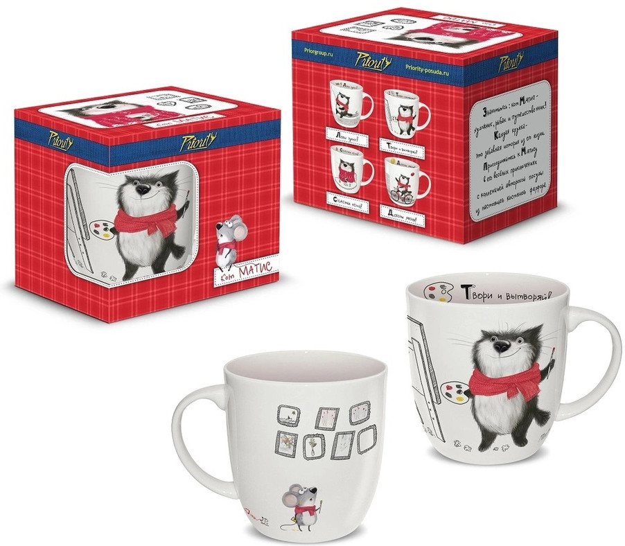 Знакомьтесь: кот Матис — художник, рыбак, путешественник и сладкоежка! Каждая кружка — это маленькая забавная история из его жизни. Матис — не новичок на рынке. Он еще не суперзвезда, но уже широко известен, ведь его портреты печатаются на календарях и канцелярских товарах. Теперь истории о приключениях кота Матиса появятся на изысканных кружках и канцелярских товарах от PrioritY. А наша компания знает толк в котиках.