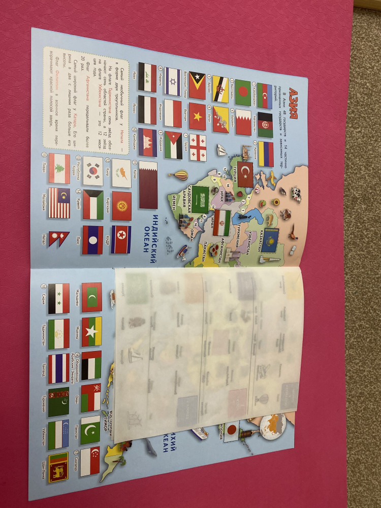 супер! для ребенка увлекшегося флагами самое то! крупный шрифт, возможность переклеить, и родителям много подсказок.