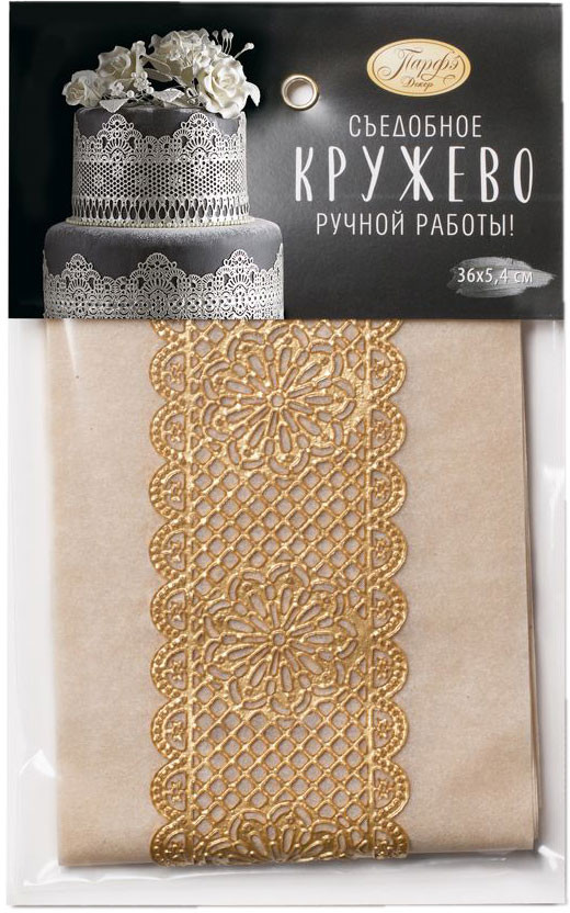Кружево пришло быстро. Прислали два разных рисунка серебряного кружева, что обрадовало. Само кружево видно уже давно лежало на складе, в связи с чем оно совершенно не хотело отлипаться от пакета, отрывали буквально по миллиметру, осторожно, чтобы не порвать, поэтому оно немного подрастянулось. В остальном все было хорошо. Сажали на крем, поэтому кружево через несколько часов стало мягким, кусалось мягко вместе с тортом. Ни каких неприятных вкусовых ощущений не было. Хочу заказать золотое как появится в продаже.