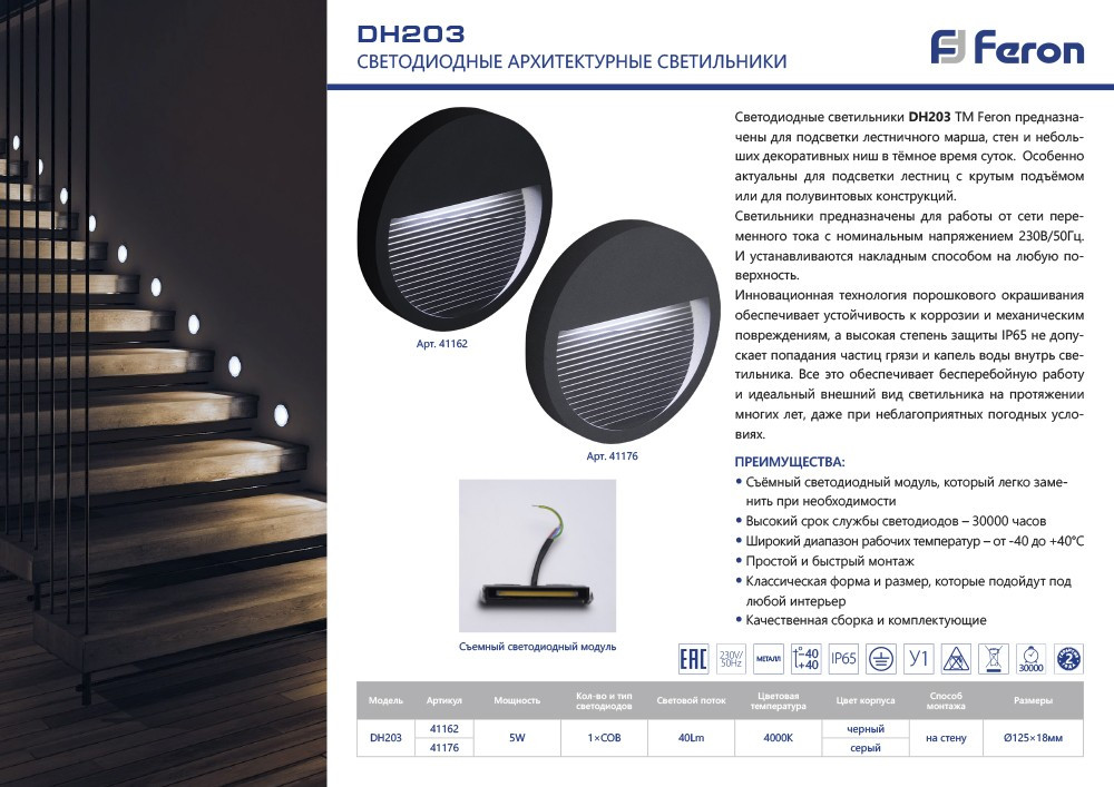 Светодиодные светильники DH203 TM Feron предназначены для подсветки лестничного марша, стен и небольших декоративных ниш в тёмное время суток. Особенно актуальны для подсветки лестниц с крутым подъёмом или для полувинтовых конструкций.