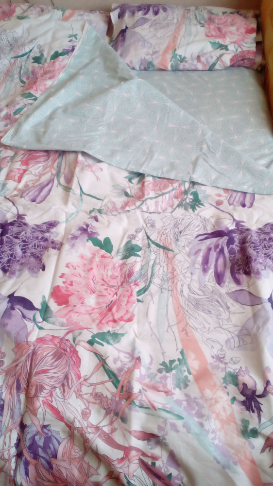 Из хорошего: приятная ткань, хорошее качество рисунка, пошив. Из печального: простынь и пододеяльник сильно перекосились после стирки. Ровно не сложишь. Из мелочи: разрез на пододеяльнике ничем не фиксируется, одеяло немного выползает.