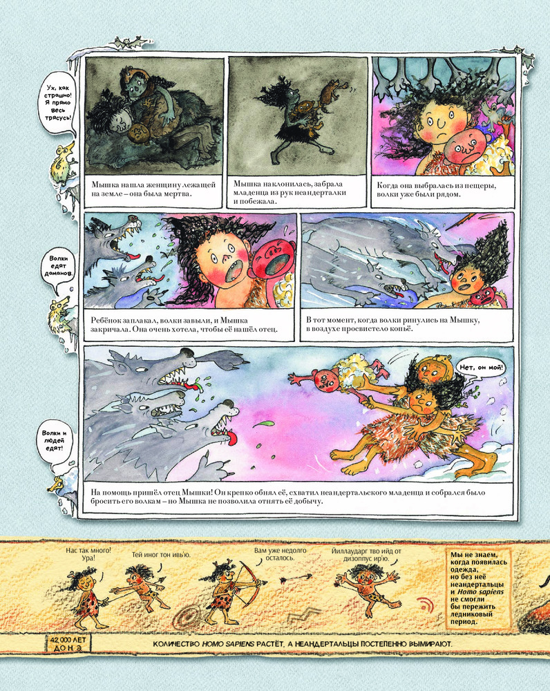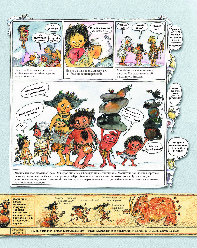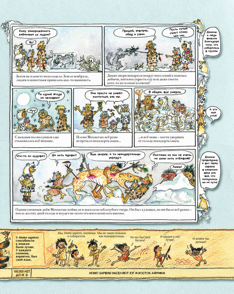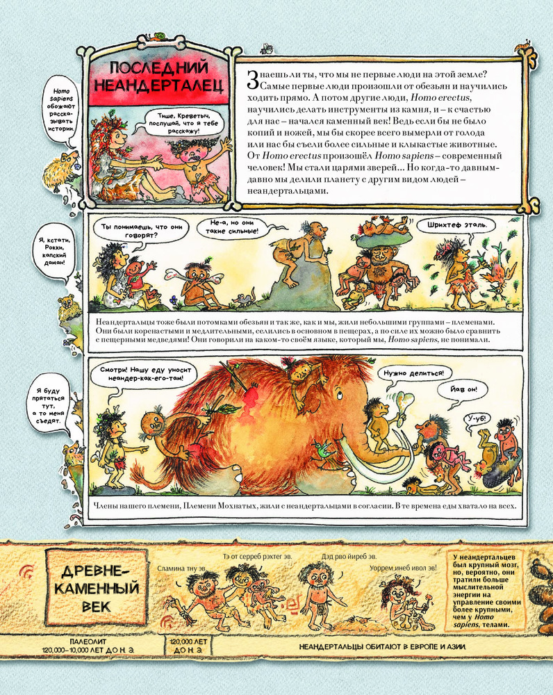 В этой книге читателей ждёт настоящее доисторическое приключение — знакомство с первыми людьми на Земле, из племени Мохнатых. Вы узнаете, как Мохнатые выживали во времена ледникового периода, как впервые добыли огонь, как из кочевников превратились в земледельцев и одомашнили диких животных. Занимательные факты, шутки и любимый детский формат — комиксы — делают эту книгу великолепным пособием по истории человечества.