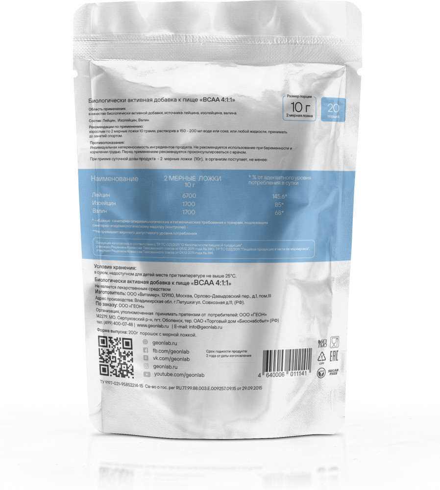 Geon Комплекс аминокислотный BCAAВ данный момент этот товар отсутствует в продаже. Возможно, у нас найдется аналогичный или похожий товар здесь. В состав ВСАА 411 входят только три ингредиента: лейцин, валин и изолейцин, взятые в соотношении 4:1:1. ВСАА эффективно борются с катаболизмом, уменьшают мышечные боли, способствуют росту мышечных волокон, быстрому восстановлению организма после тренировки. При употреблении ВСАА с углеводами значительно увеличивается выработка собственного инсулина, являющегося анаболическим гормоном. ВСАА 411 отличаются исключительной чистотой. В состав продукта не входят никакие балластные вещества, в результате, приобретая ВСАА 411 вы платите именно за чистые ВСАА. |