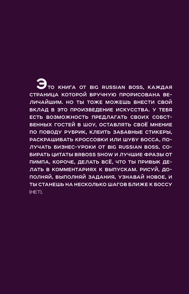 💳 Оплатить за товар можно при получении 🇰🇿 Есть бесплатная доставка по Казахстану от 1 дня 🎁 Копите бонусы с каждой покупки BIG RUSSIAN BOSS — АМЕРИКАНСКИЙ РЭП-ИСПОЛНИТЕЛЬ, ВЕДУЩИЙ самого популярного ОДНОИМЁННОГО ШОУ НА YOUTUBE с 2,5 млн подписчиков! Это книга от Big Russian Boss, каждая страница которой вручную прорисована Величайшим. Но ты тоже можешь внести свой вклад в это произведение искусства. У тебя есть возможность предлагать своих собственных гостей в шоу, оставлять своё мнение по поводу рубрик, клеить забавные стикеры, раскрашивать кроссовки или шубу Босса, получать бизнес-уроки от Big Russian Boss, собирать цитаты BRBoss Show и лучшие фразы от Пимпа, короче, делать всё, что ты привык делать в комментариях к выпускам. Рисуй, дополняй, выполняй задания, узнавай новое, и ты станешь на несколько шагов ближе к Боссу (нет). |