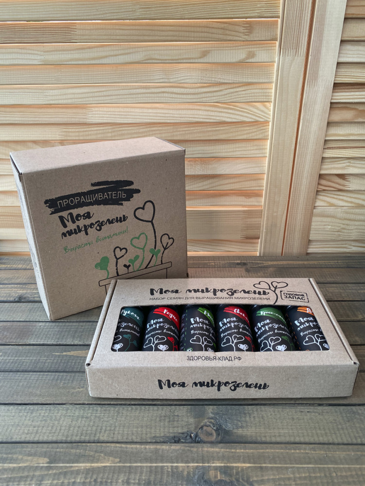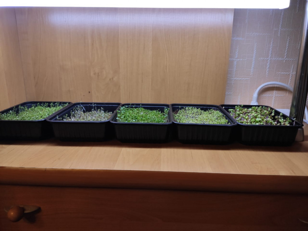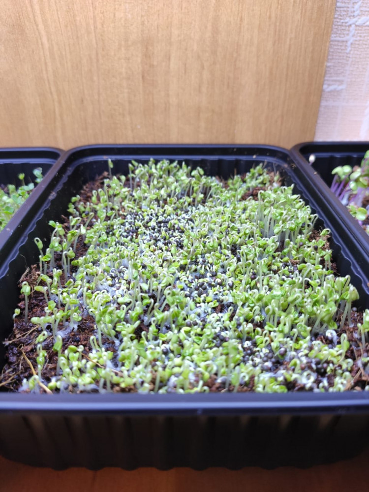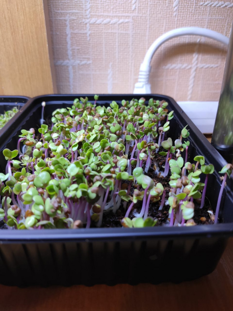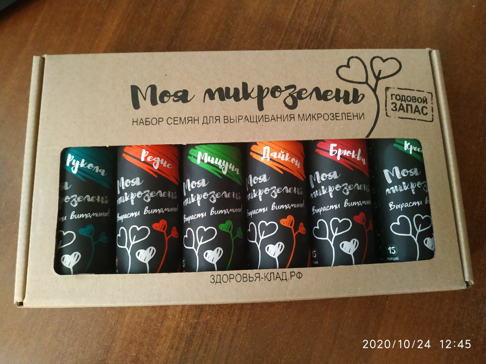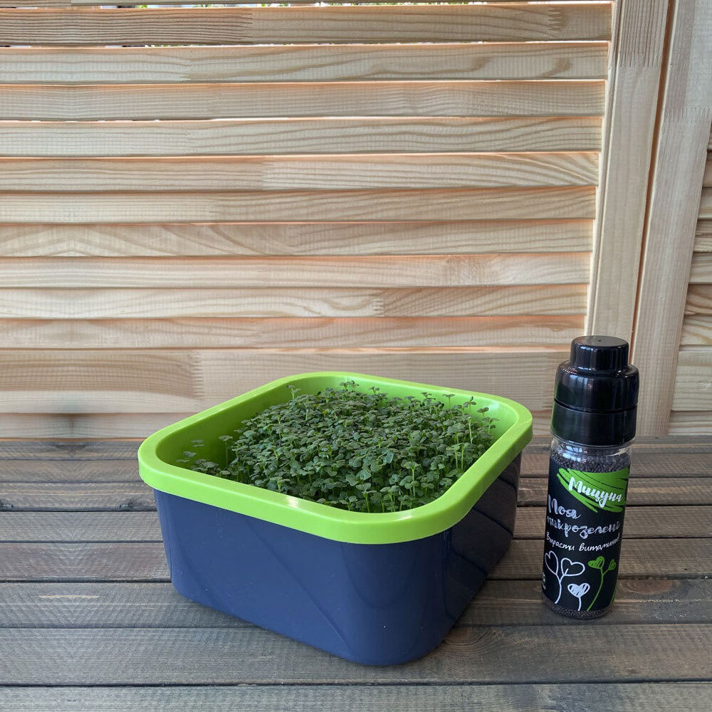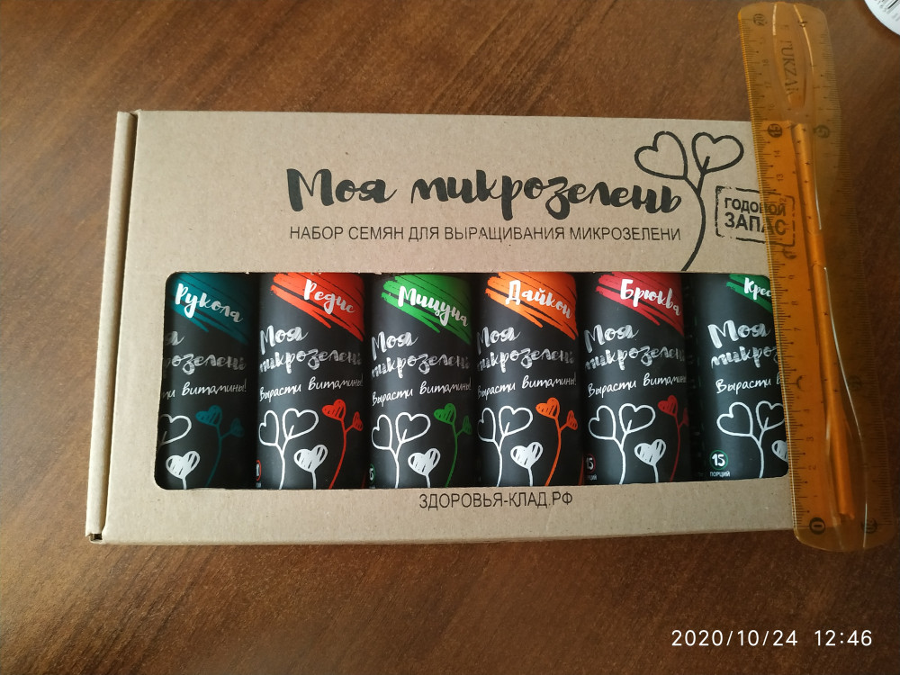 забыла написать, что наборы могут отличаться по составу. В моём наборе: рукола, редис, мицуна, кресс-салат, брюква и микс семян. В микс семян входит люцерна, мицуна, кресс-салат и редис.