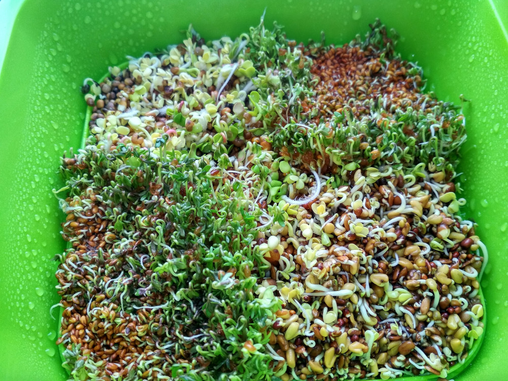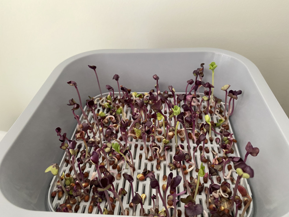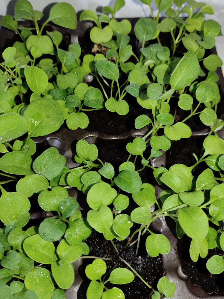 Про редис я уже писала, вот фото практически всех семян (почему-то больше 4 фото нельзя оставить, кресс-салат не поместился). Всходы есть у всех семян. Быстрее всего всходит редис, самый неудачный набор - это микс семян, что-то всходит быстрее, что-то дольше, плюс разные по размеру, вместо него лучше бы были семена свёклы. Выращивала разными способами, в разной таре: на плоской тарелке на салфетке - самый неудачный способ, если налить много воды - могут загнить, если мало - могут засохнуть, лучше на ватных дисках, вата держит влагу лучше. А так мой фаворит - форма для сыра и фруктомойка, корни прорастают сквозь дырочки и легко "пьют водичку". Такую конструкцию можно соорудить из чего угодно. Все семена кроме редиса выращивала застелив дно бумажной салфеткой, так как мелкие семена просто проваливались в ячейки. Руколу так же выращивала в торфяных таблетках, хотела вырастить полноценного размера, но это оказалось очень долго. на фото по порядку: микс семян, брюква, мецуна и рукола. Кресс-салат, как я уже писала, не поместился, но всходы хорошие.