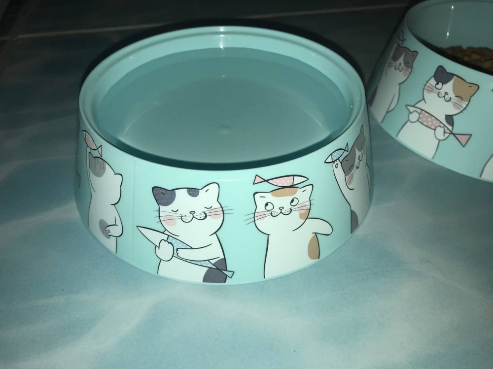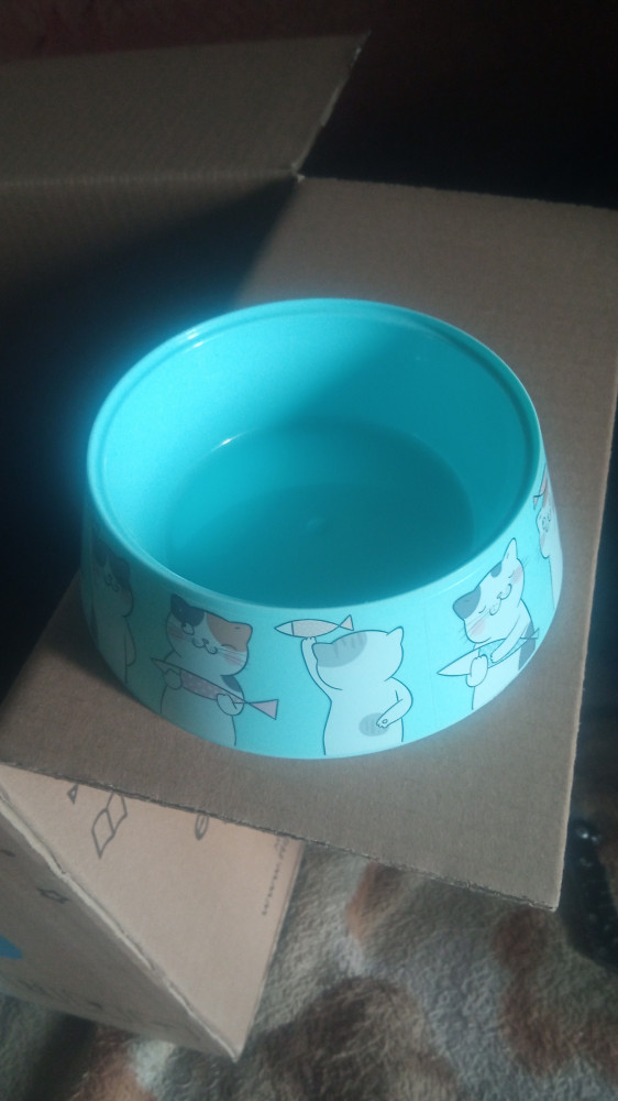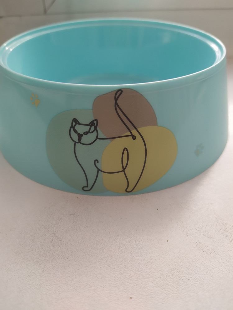 Очень милый рисунок на миске, купила для воды. Стенки в форме конуса, предотвращают миску от случайного переворачивания. Для сухого корма все же лучше миска потяжелее, потому что моя кошка "возит" ее по всей кухне.